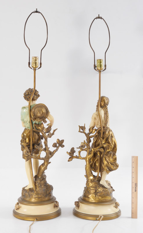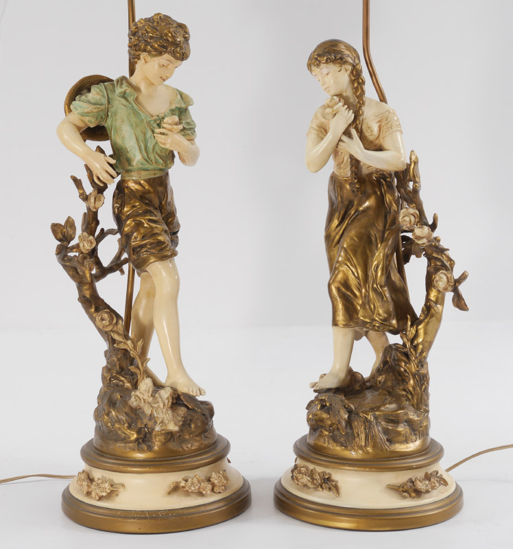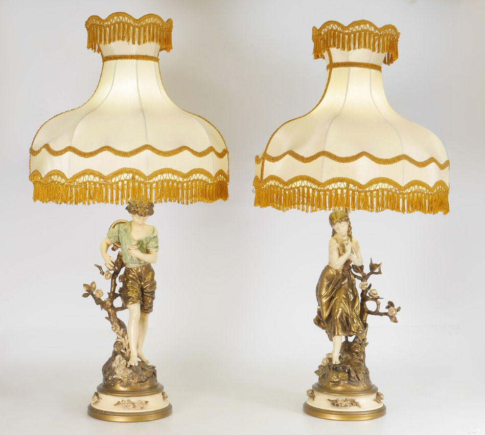 PAIR OF PAINTED SPELTER LAMPS AFTER MOREAU: French style figure of a boy and girl, bases measures 32'' h. x 9'', fringed cloth shades measures 20'' x 22 3/4''.