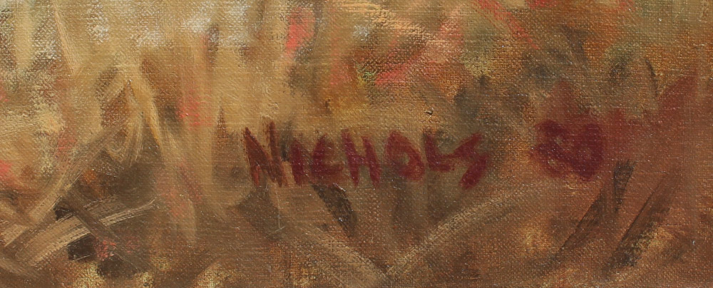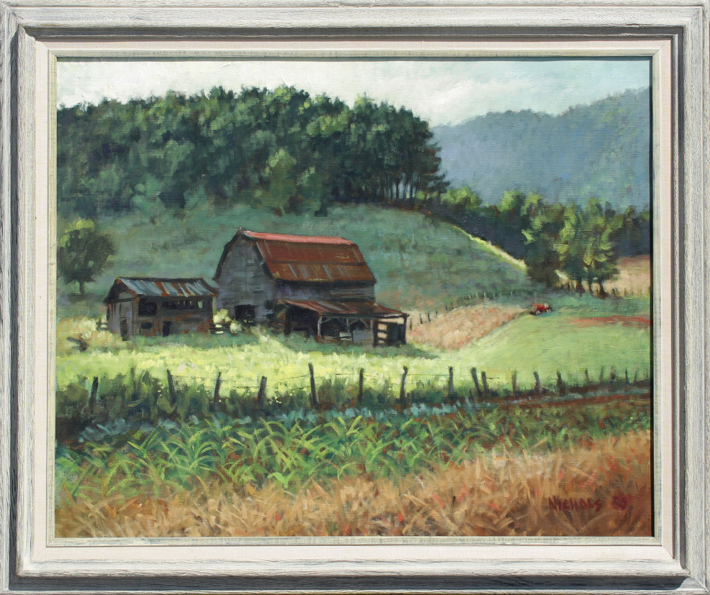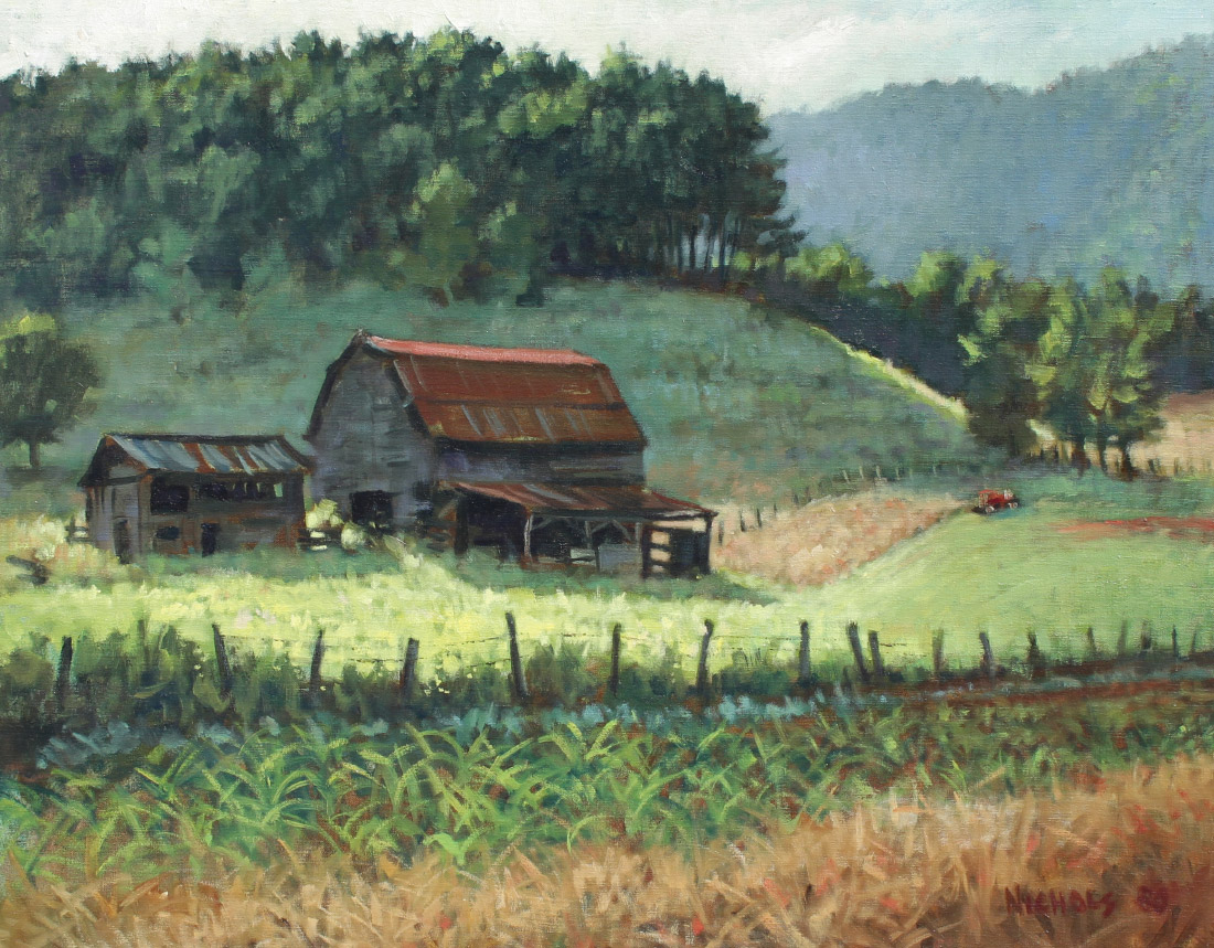 NICHOLS, Roy, (American, 20th C.): ''Into the Sunlight, Tuskegee'', Depicts a Rural Valley Scene with Barn, Oil/Canvas, 24'' x 30'', signed lower right, original artist's business card affixed verso with the title, painted barnwood style frame, 29 1/2'' x 35 1/2''.