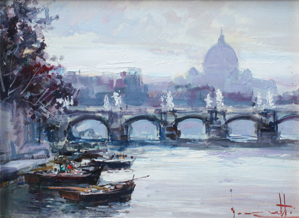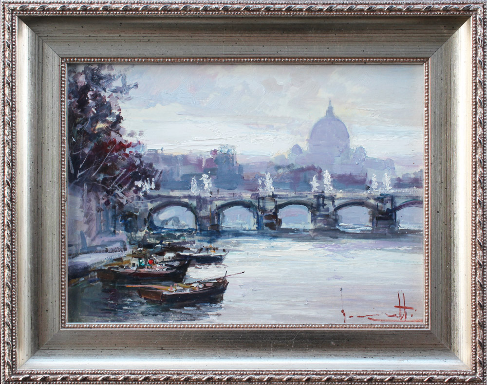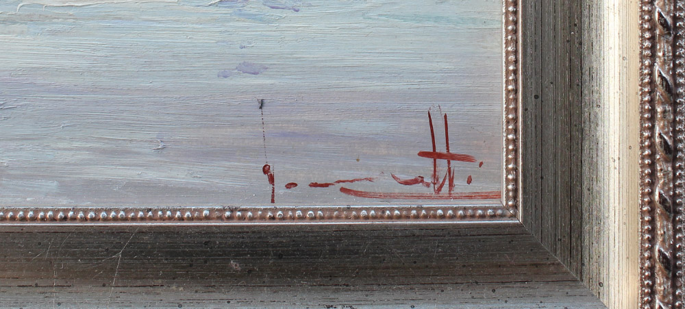 ILLEGIBLY SIGNED VENETIAN PAINTING: Oil/Board, 7'' x 9 1/2'', signed lower right, View From A Canal with Doges in the Distance, contemporary frame, 10'' x 12''.