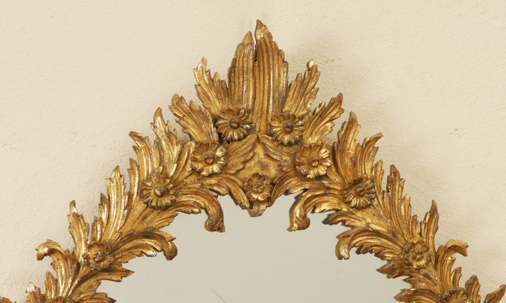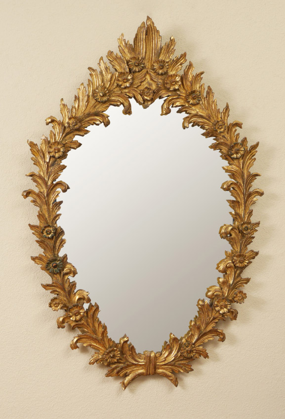 CARVED GILT WOOD WALL MIRROR: Foliate motif, 49'' h. x 32 1/4'' x 1 1/2''.