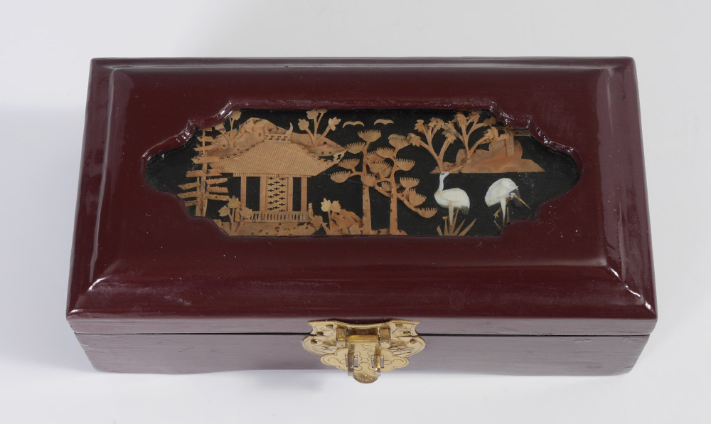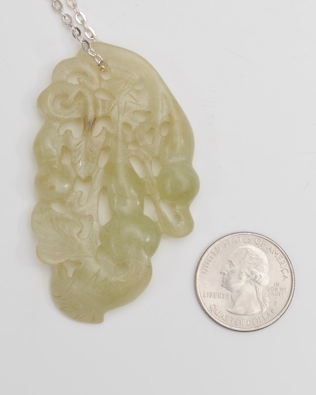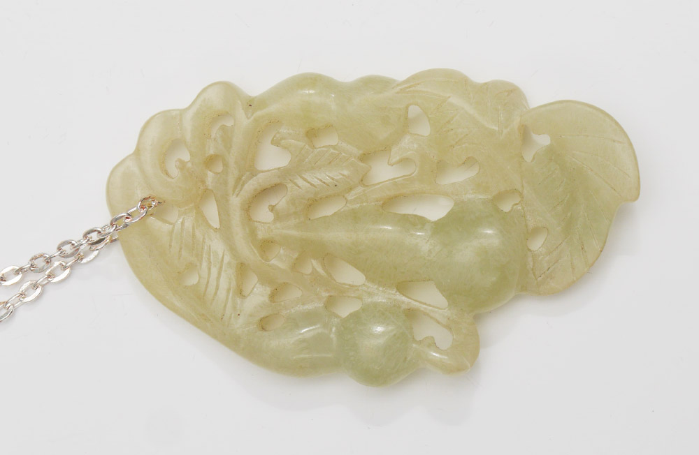 CHINESE CARVED STONE PENDANT IN JEWELRY BOX: 2 pieces total to include 1) Foliate motif with double gourd carved pendant on silver toned chain, 3'' long. 2) Jewelry box with carved bamboo landscape under glass on hinged lid, fitted interior, 2 3/4'' h. x 6 1/2'' x 3 1/2''.