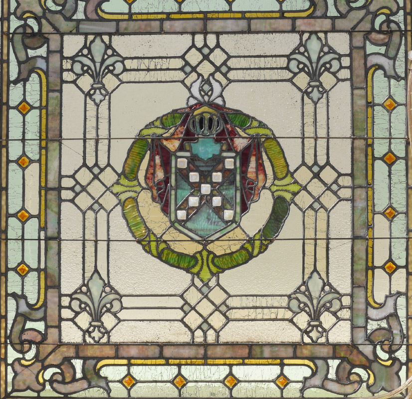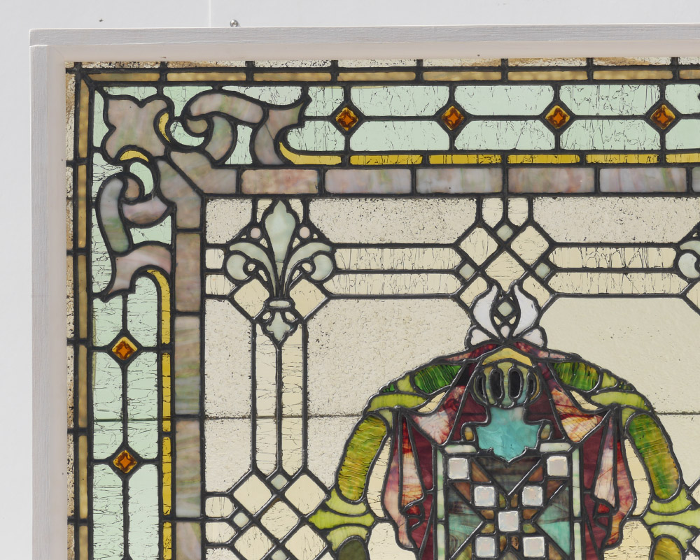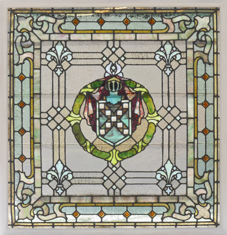 LARGE SQUARE PANEL OF LEADED GLASS: Heraldic helmet and shield coat of arms center medallion, fleur de lis, foliate corners. Mounted in back illuminated wood frame, 43 3/4'' h. x 42'' x 2 1/2''.