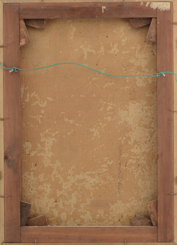 CONDITION: Older reline, stretcher bar wear, craquelure throughout, several repairs to punctures, scattered inpaint, frame has wear and overpaint. Sold as is.