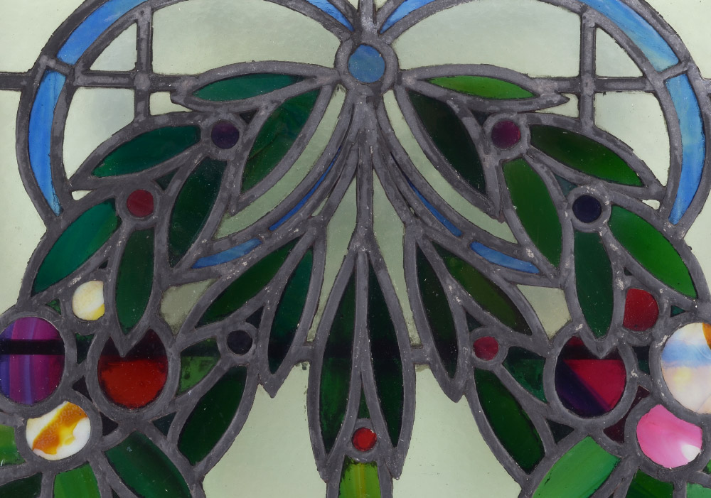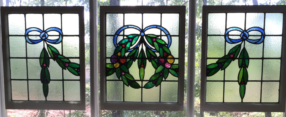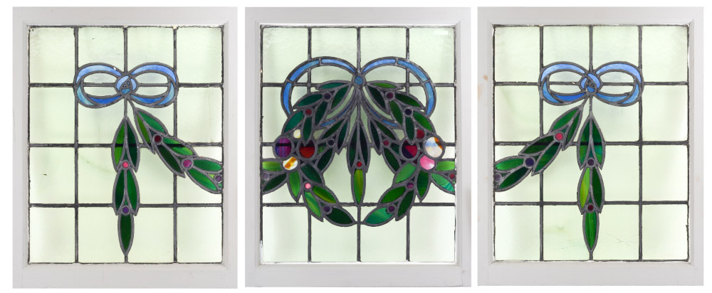 ENGLISH TRIPTYCH OF LEADED GLASS WINDOWS: Center window with wreath and garland motif extending to 2 side window, all matched in size. Overall in wood frames 35'' x 28'' x 1 3/4''.