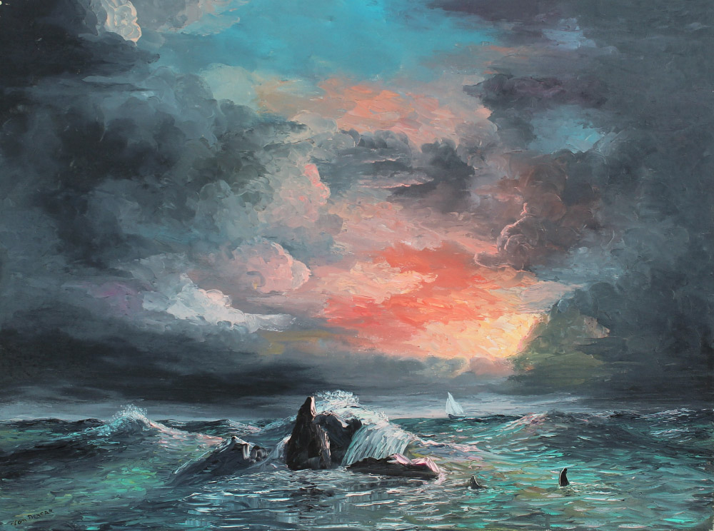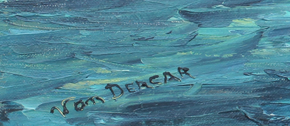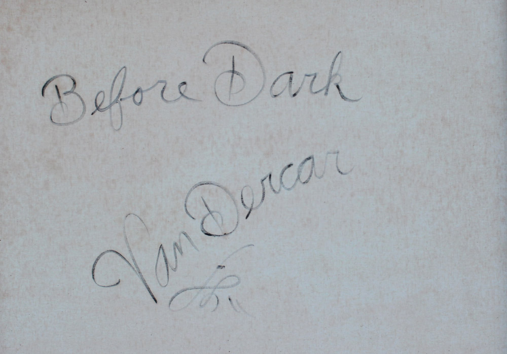 VAN DERCAR, Lewis (American, 1913-1988): ''Before Dark'', Depicts sailboat offshore with sharks swimming in the water, Oil/Canvas, 36'' x 48'', signed lower left, signed and titled verso, unframed.