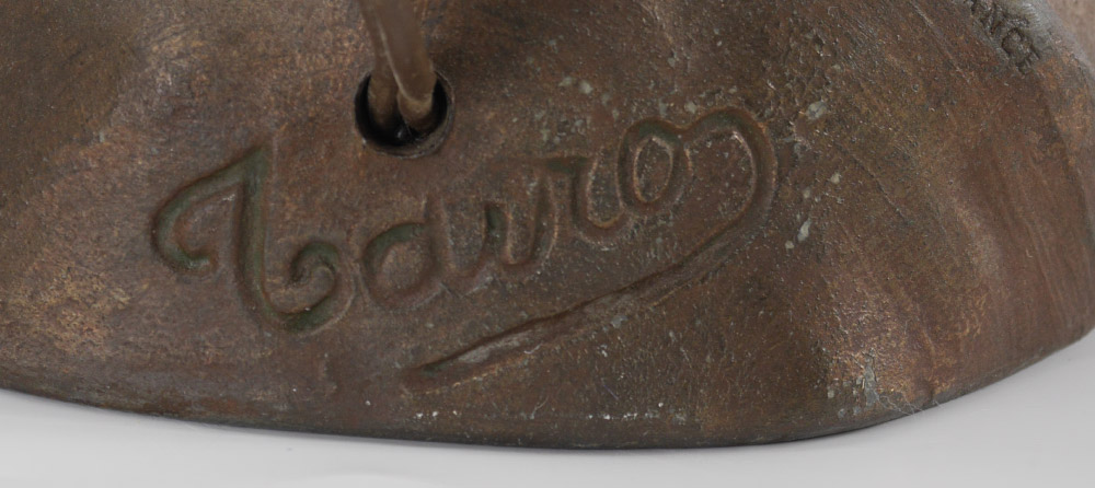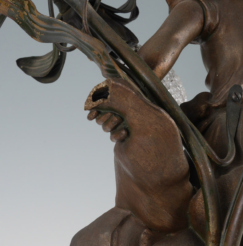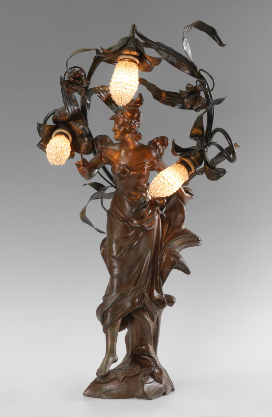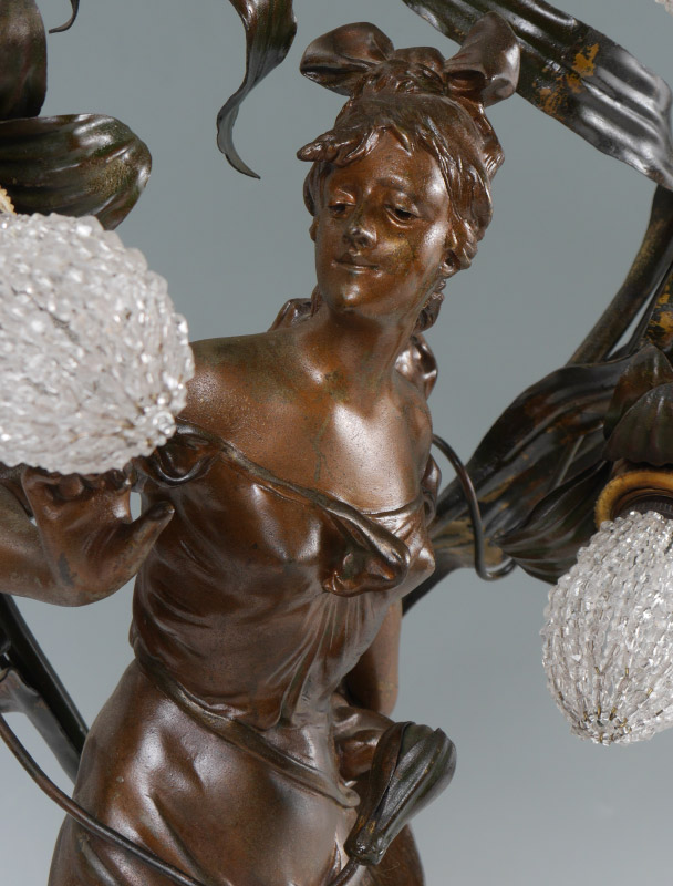 FRENCH SPELTER FIGURAL NOUVEAU LAMP: Patinated figure of a maiden with foliate back, 3 lights with floral bobeche, beaded bulb covers. Illegibly signed Tairos?, stamped ''Made in France''. Overall measures 27 1/2'' h. x 16 1/4'' x 14''.
