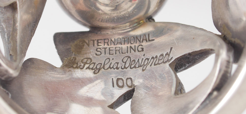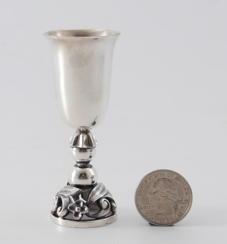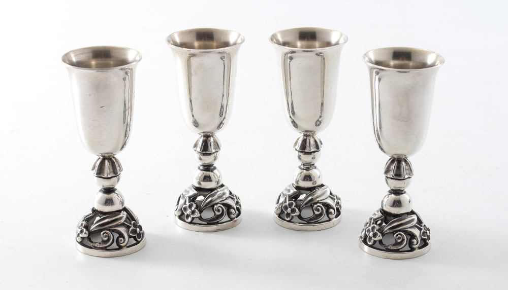 4 ALPHONSE LAPAGLIA FOR INTERNATIONAL STERLING CORDIALS: Designed by LaPaglia for International Silver, pierced work floral motif base. Each 3 1/4'' h. x 1 1/4'', approx. 5.8 troy oz.