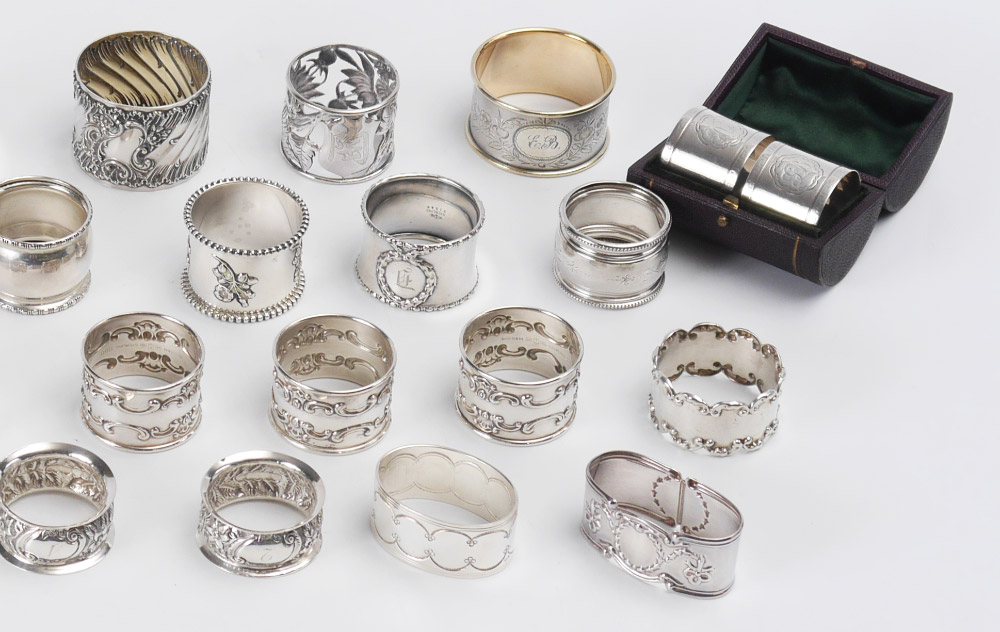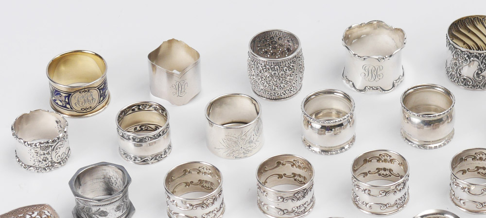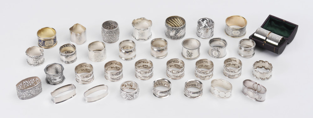 COLLECTION OF 26 STERLING NAPKIN RINGS: 32 pieces total, 26 are sterling from assorted makers from assorted countries including US, England, Mexico, Russia and more. 6 with no marks, not included in weight of approx. 19.6 troy oz.