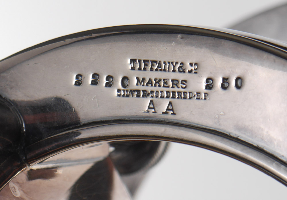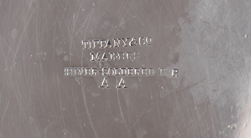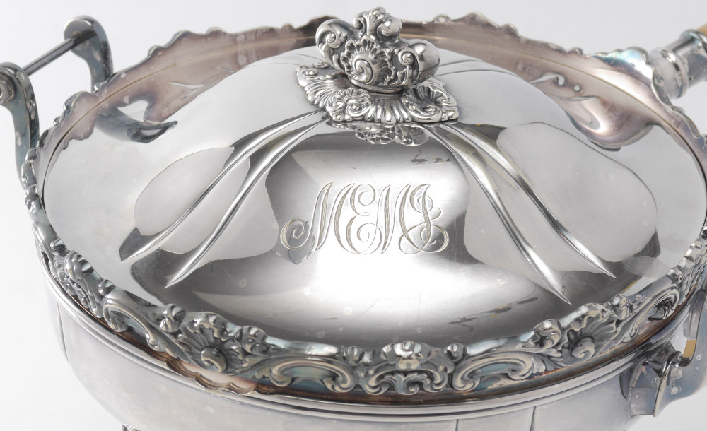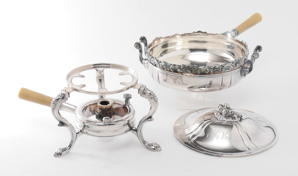TIFFANY SILVERPLATE CHAFING DISH ON STAND: Chafing dish with embossed rim and finial, original stand with burner. Dish and stand with mammoth handles, marked ''Tiffany & Co. Makers, Silver-Soldered-E.P., A.A.''. Monogrammed, overall measures 11'' h. x 16 1/2''.