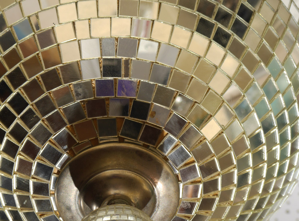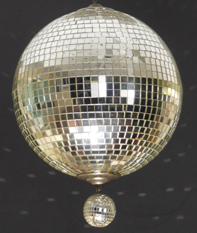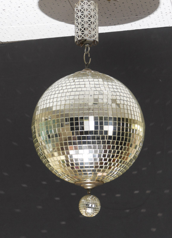 A DISCO BALL FROM STUDIO 54: Reputedly from one of the many redesigns of the infamous Studio 54 in New York City, circa late 1970's to the 1980's. Double ball, motor mounted drive, overall measures 24'' h. x 11''. CONDITION: Currently still spinning.