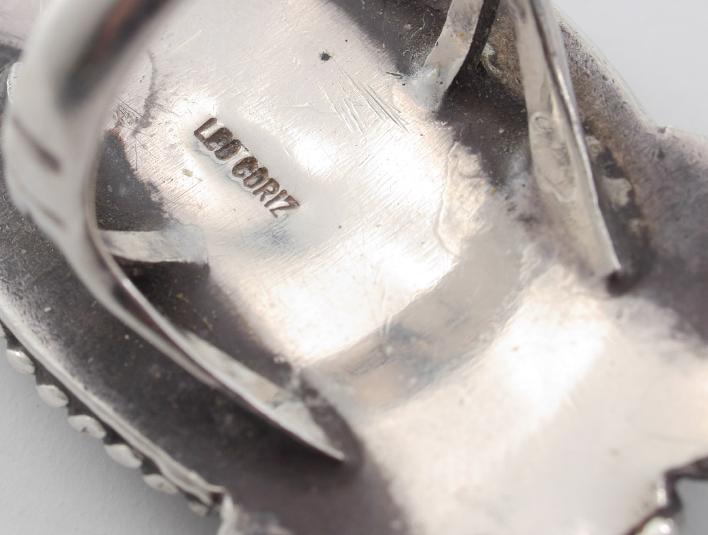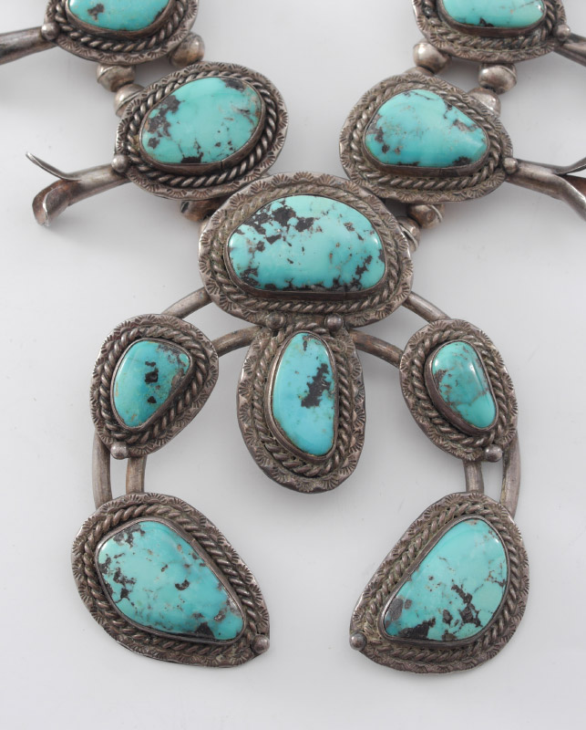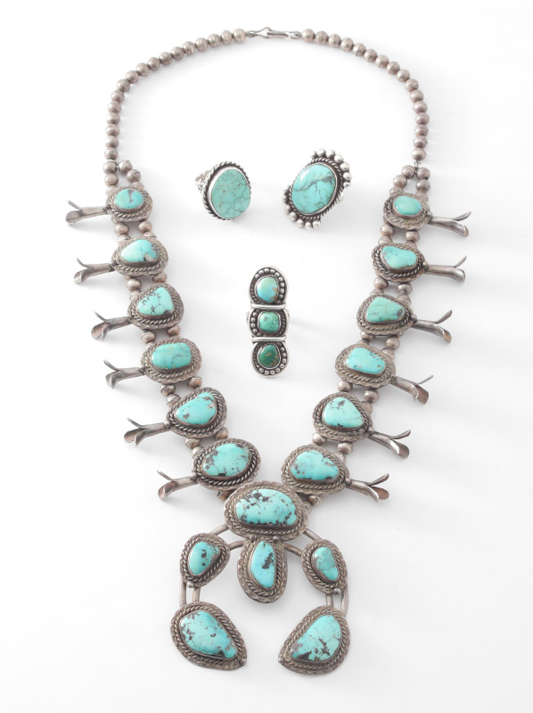 VINTAGE TURQUOISE SQUASH BLOSSOM NECKLACE: Unmarked sterling naja 3 1/4'' h., overall 25 3/4'' long. Sold with 3 silver & turquoise rings, one stamped Leo Coriz, the others unmarked.