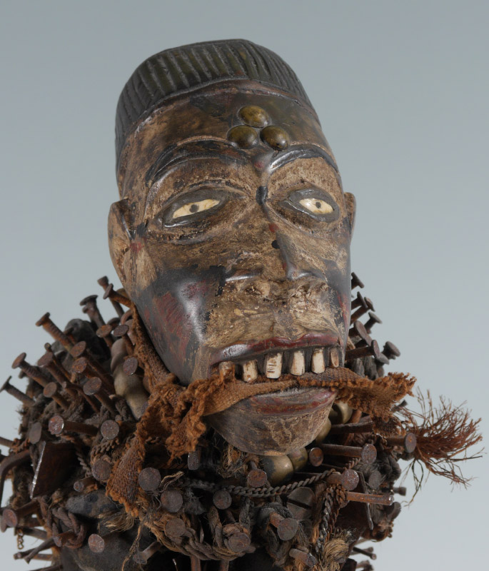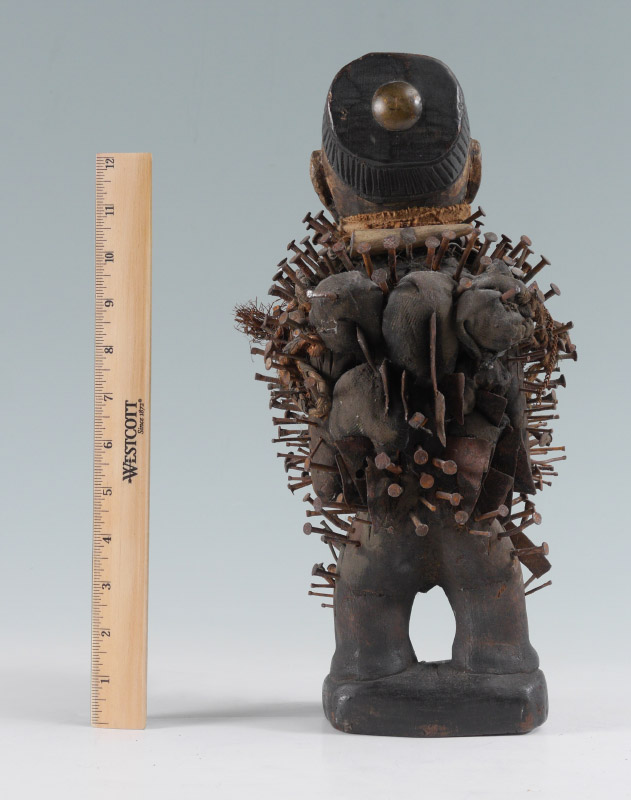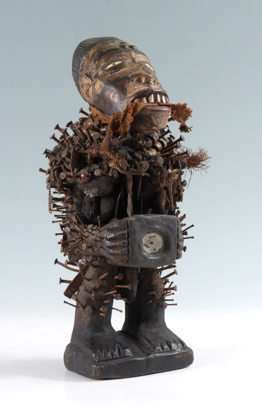 AFRICAN CARVED BAKONGO NAIL FETISH FIGURINE: Carved wood paint decorated figure with nails, beads, mirror and brads. Bakongo tribe, Congo. 14'' h. x 7'' x 5 1/2''.