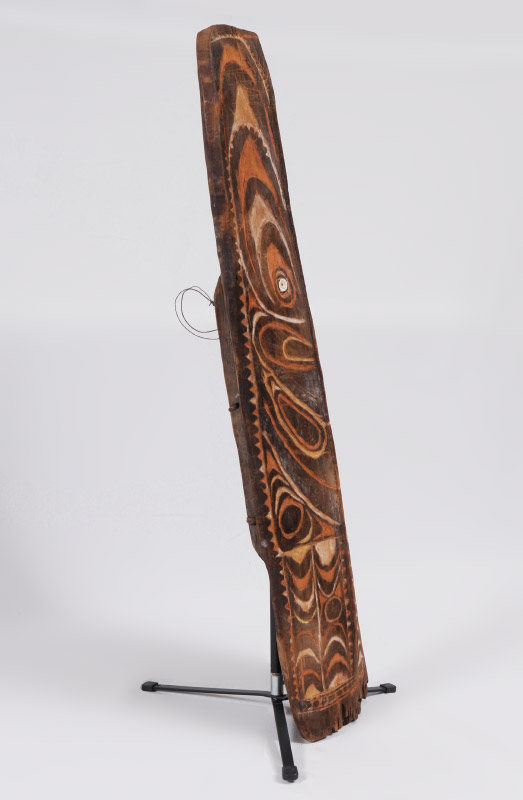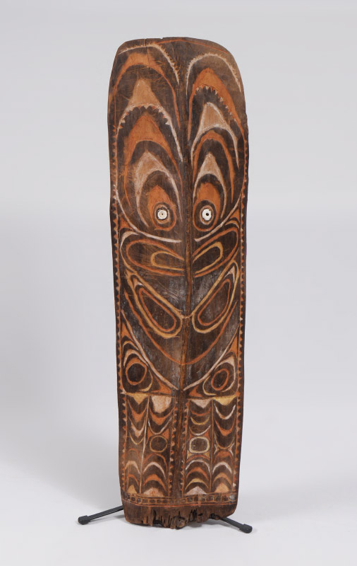 CARVED OCEANIC SEPIK RIVER BOARD MASK: Carved and decorated with orange and white highlights, inset shell eyes. Sepik River region, New Guinea, 52'' h. x 15 1/2'' x 5''.