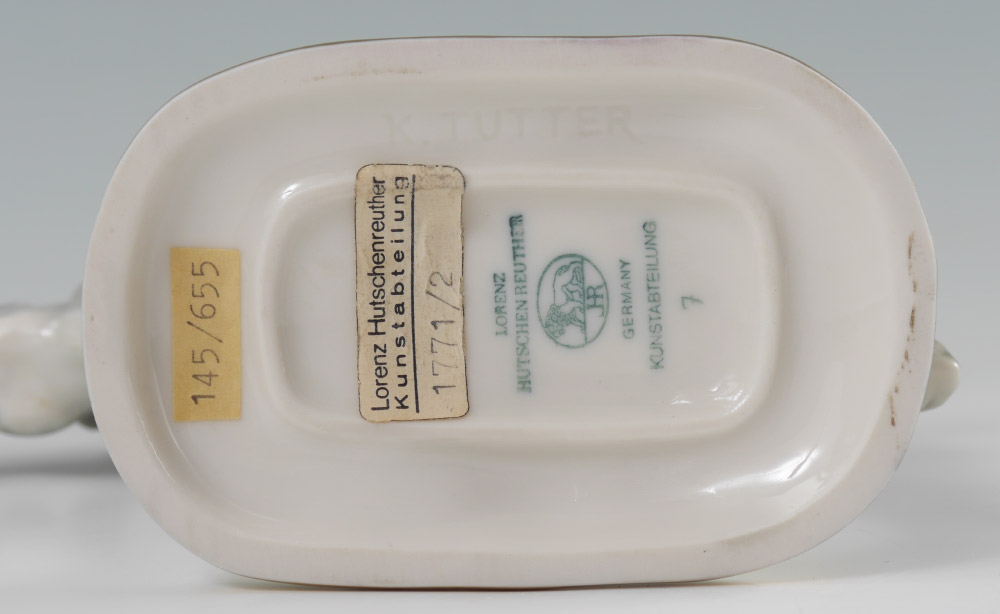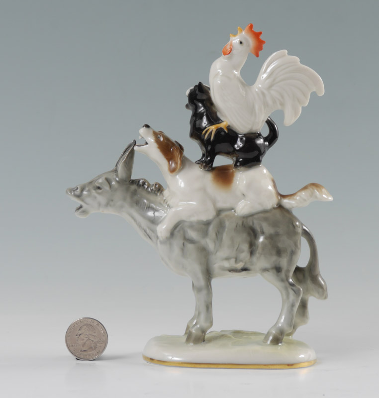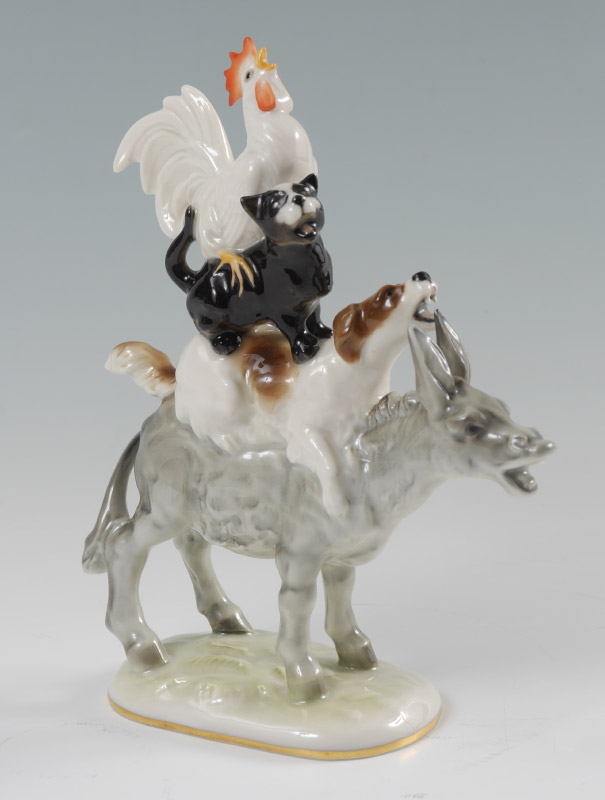 HUTSCHENREUTHER PORCELAIN TOWN MUSICIANS OF BREMEN FIGURINE: 4 animal figural group, ''Town Musicians of Bremen'', impressed with K. Tutter, blue Lorenz Hutschenreuther mark and label. Measures 7 1/2'' h. x 6'' x 2 1/2''.