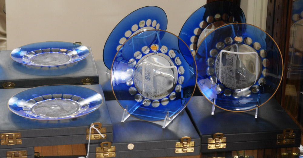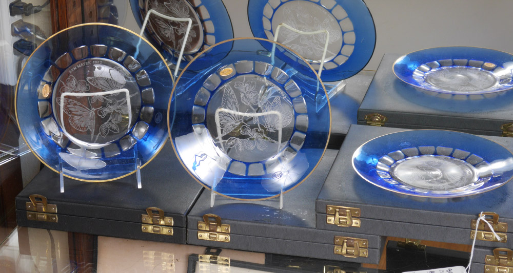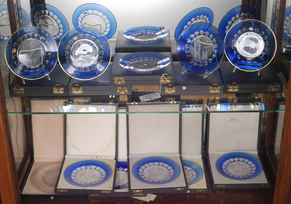 10 MOSER GLASS LIMITED EDITION PLATES: Cobalt cut to clear. All are 1972 Den Matek and Vanoce. Measure 7 1/2'' dia. All sold with the box.