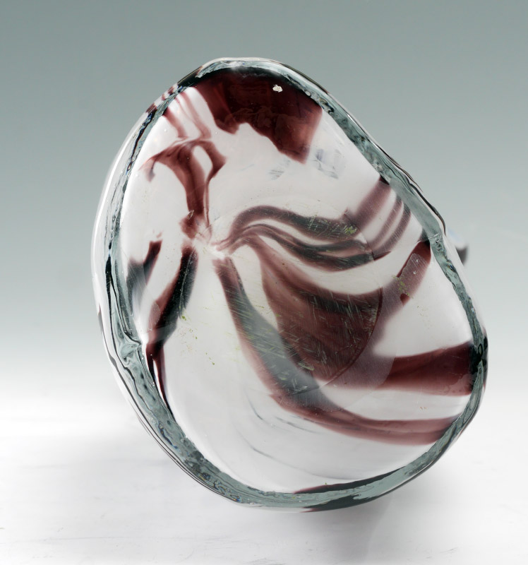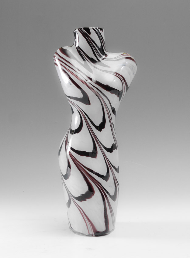 MURANO FEAMLE TORSO ART GLASS VASE: White and amethyst swirl figural female torso, no visible signature, 17 1/4'' x 7'' x 5''.