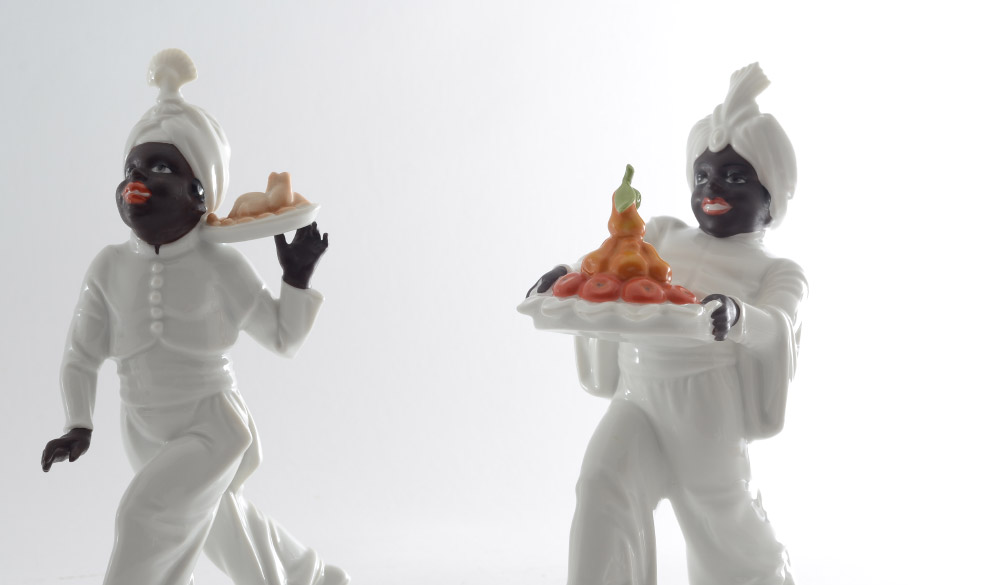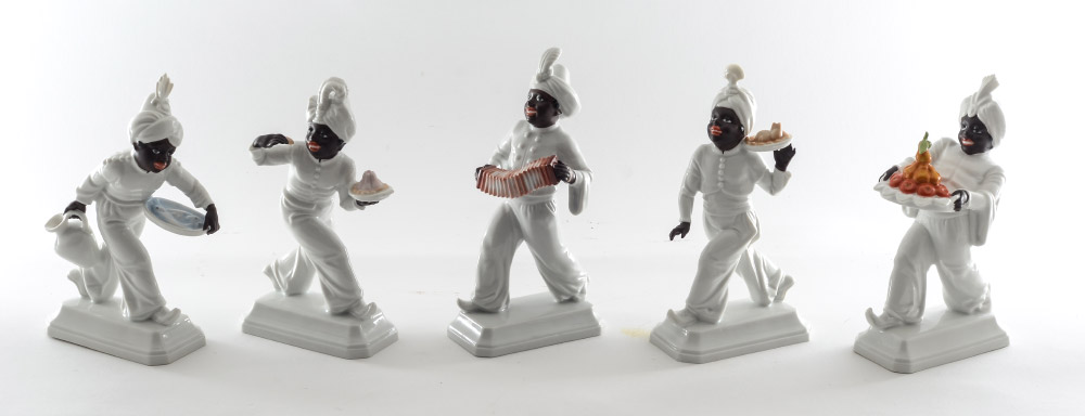 5 ROSENTHAL BLACKAMOOR FIGURINES: 5 piece set designed by H. Meisel with 4 serving food and a musician. Each marked with green Rosenthal mark and impressed H. Meisel. Average size 7 1/4'' h. x 4 1/4'' x 2 3/4''.