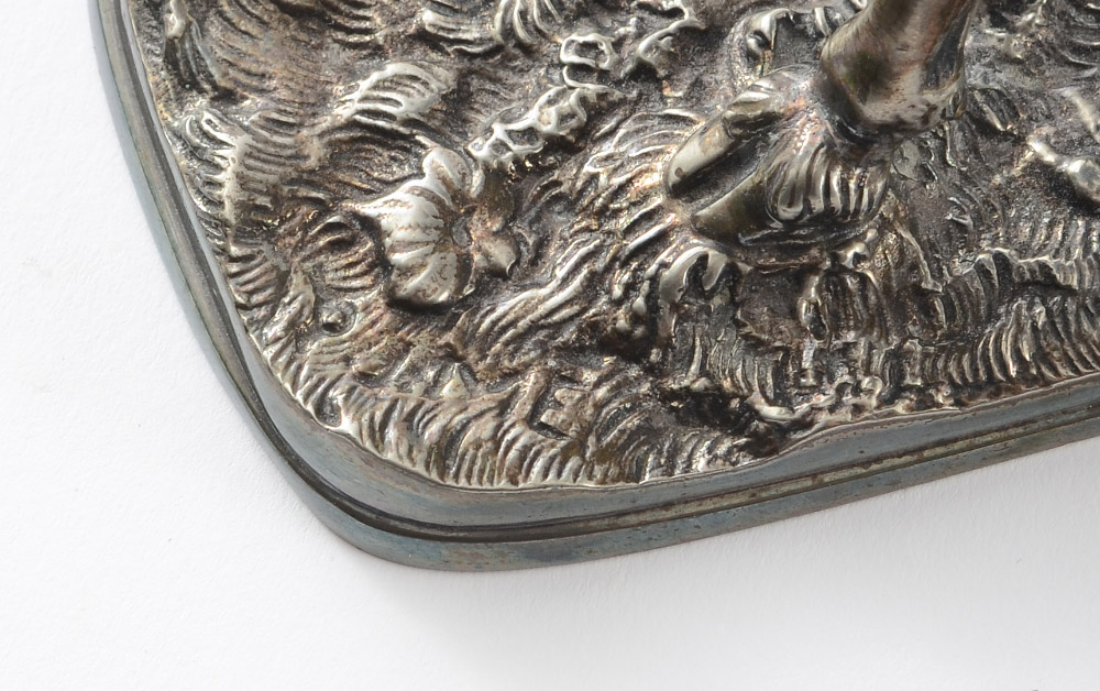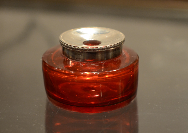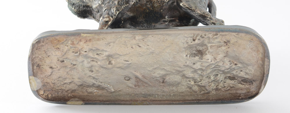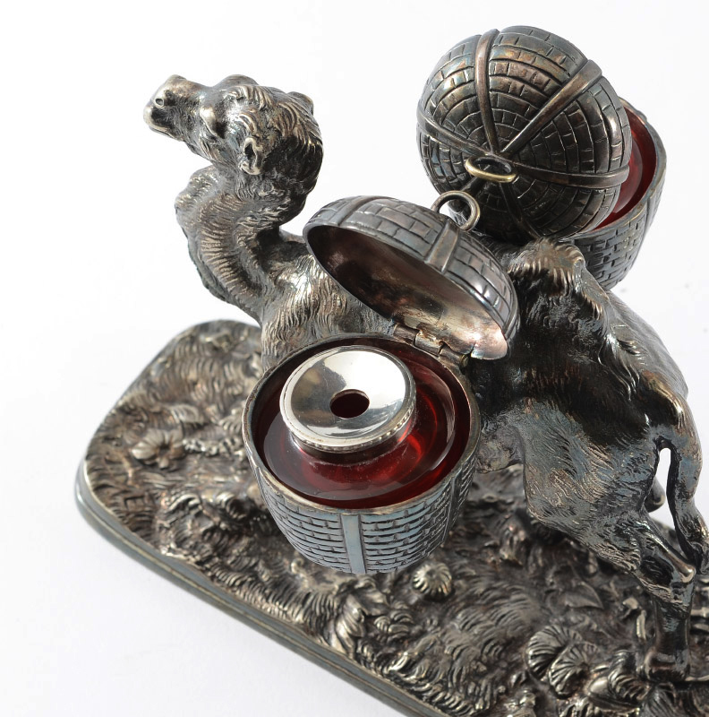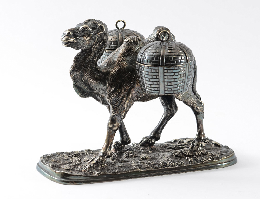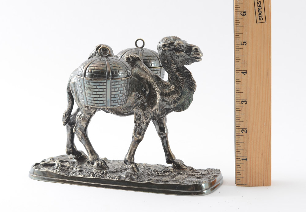 SILVERPLATE CAMEL FIGURAL INK STAND: Figure of a standing camel with basket either side. Hinged lid opens to reveal cranberry glass inkwell inserts. Signed on base ''JME''?, overall 4 3/4'' h. x 7'' x 5''.
