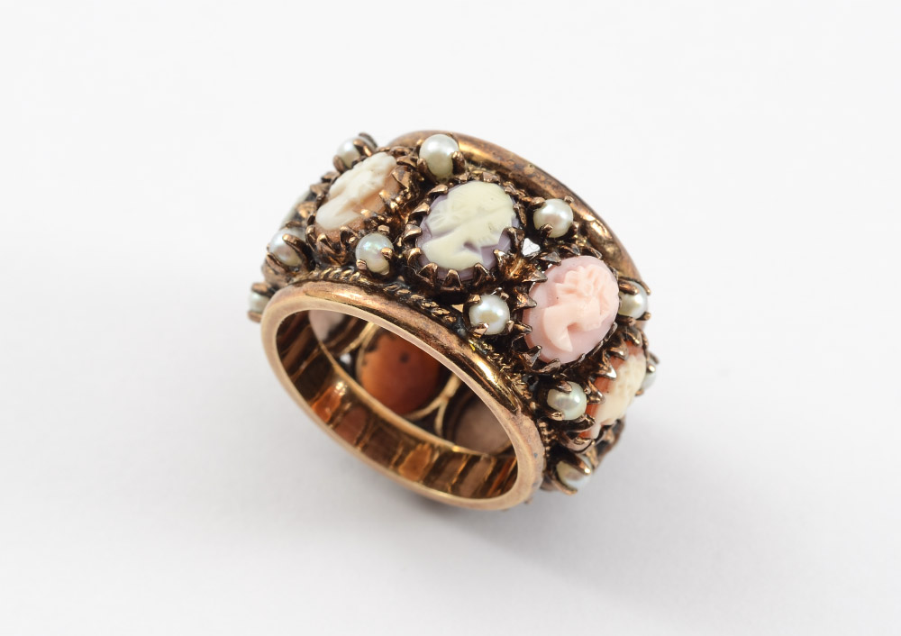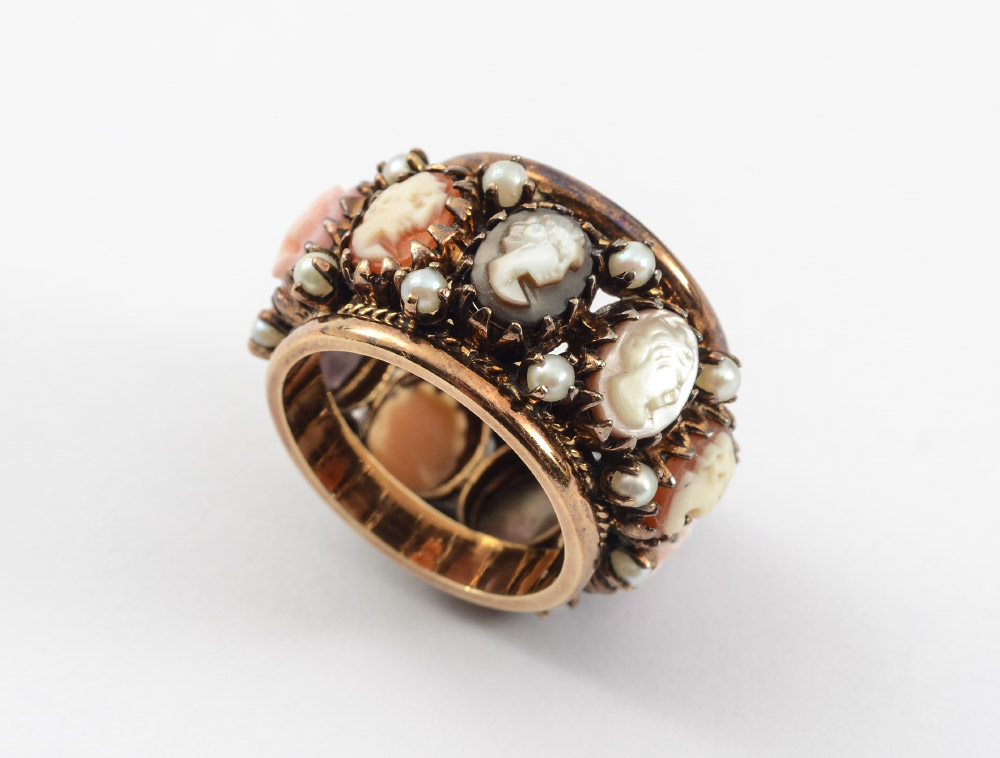 14K CAMEO RING: An unusual 14K gold band ring, 16 mm wide, prong set with 9 carved shell cameos and seed pearls. Weight: 14.6 grams inclusive. Size: 8