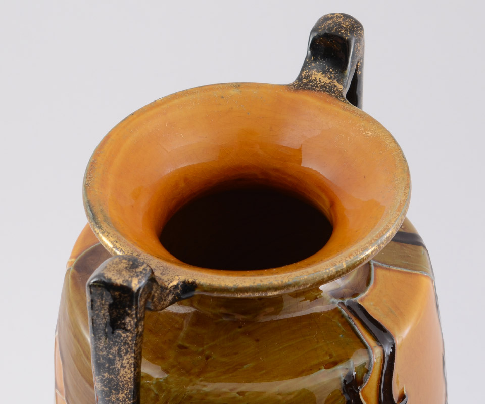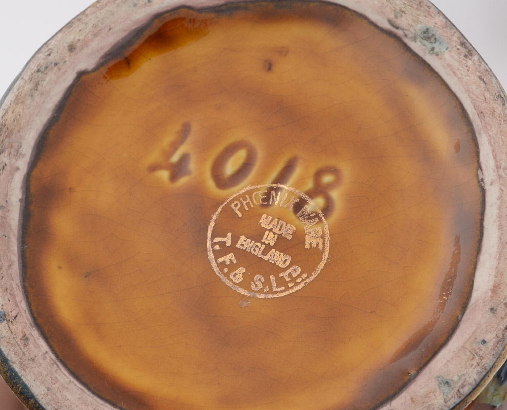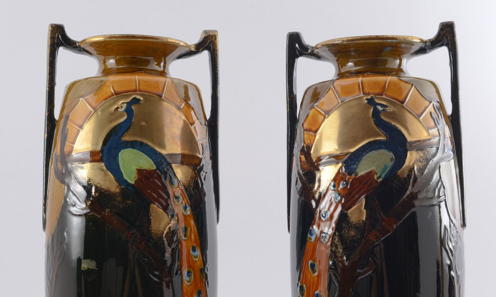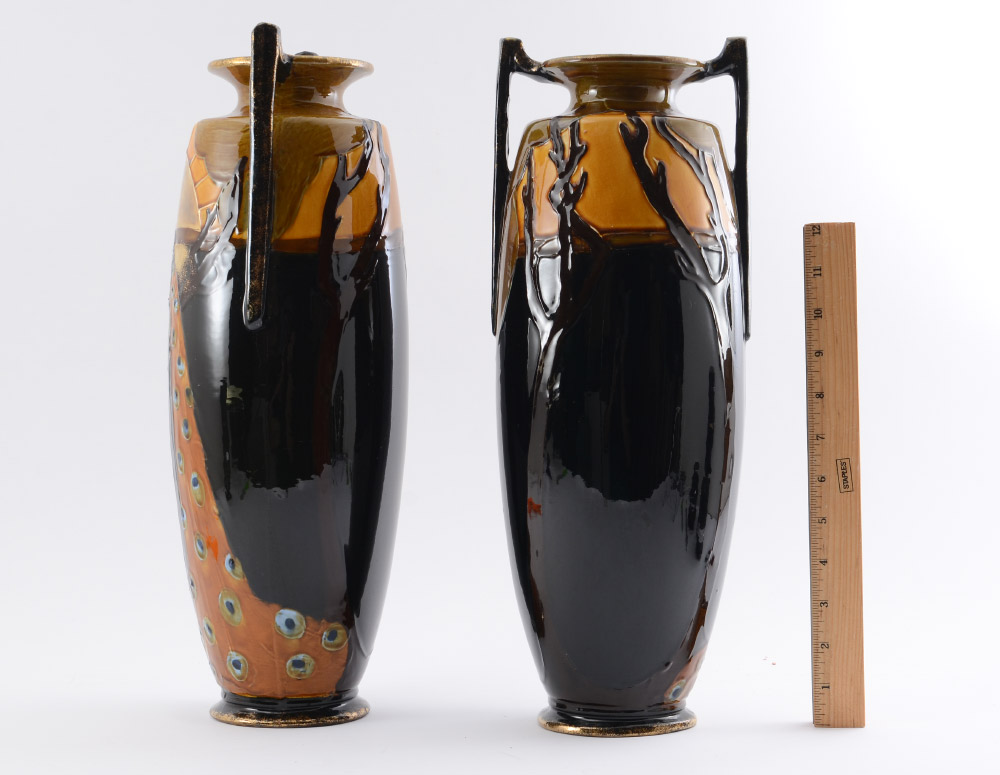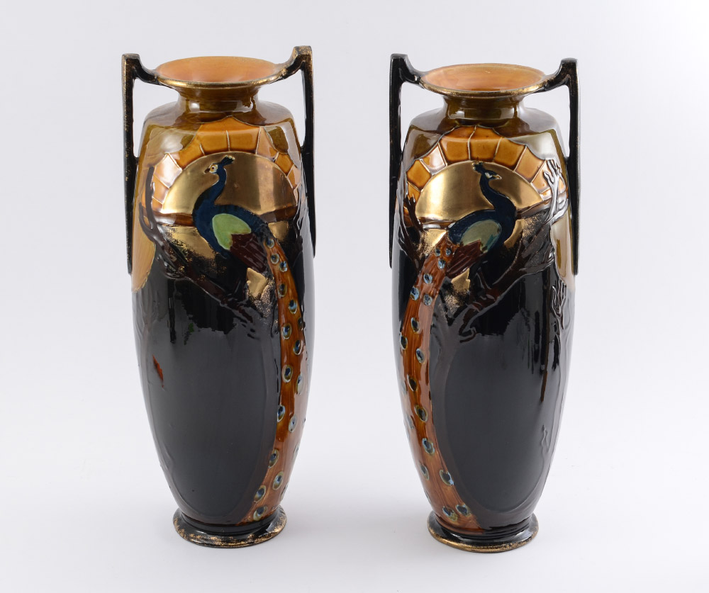 PAIR OF THOMAS FORESTER PHOENIX WARE VASES: English art ceramic vases featuring mirror image of peacocks on branch design. Double handled. Thomas Forester & Sons Ltd, mark on base, impressed 4018. Overall measures 16 3/4'' h. x 6''.