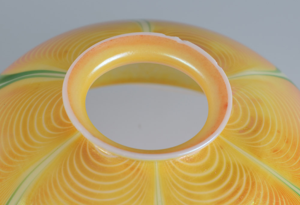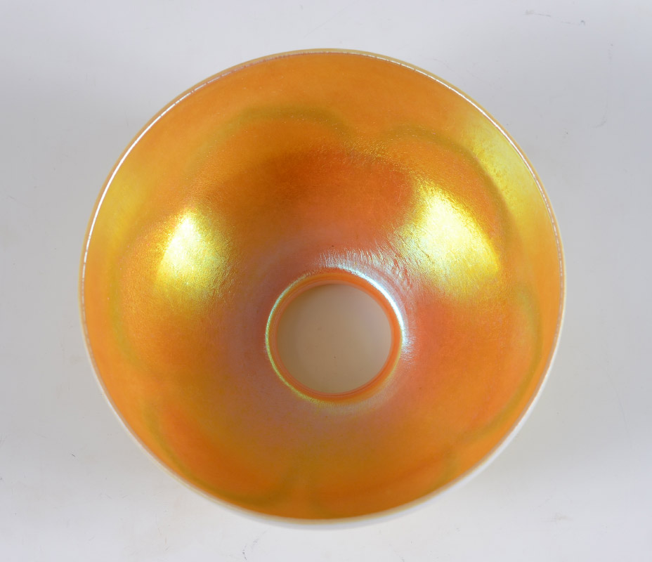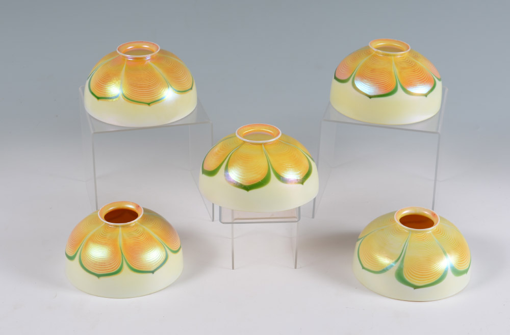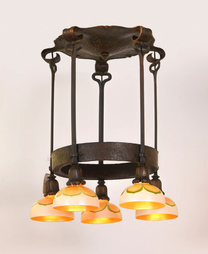 VINTAGE HAND HAMMERED COPPER CEILING LIGHT WITH ART GLASS SHADES attrib. STEUBEN: 5 light arts & crafts ceiling fixture, hand hammered coppered, top with scroll design, 5 rods over lower ring, crimped shade holders. Overall measures 21'' h. excluding shades x 17 1/2''. 5 pulled feather art glass shades attributed to Steuben, 3 1/4'' h. x 6'' dia., 2 1/2'' fitter rim.