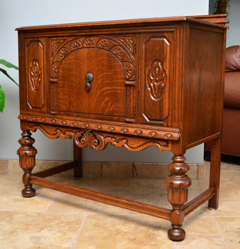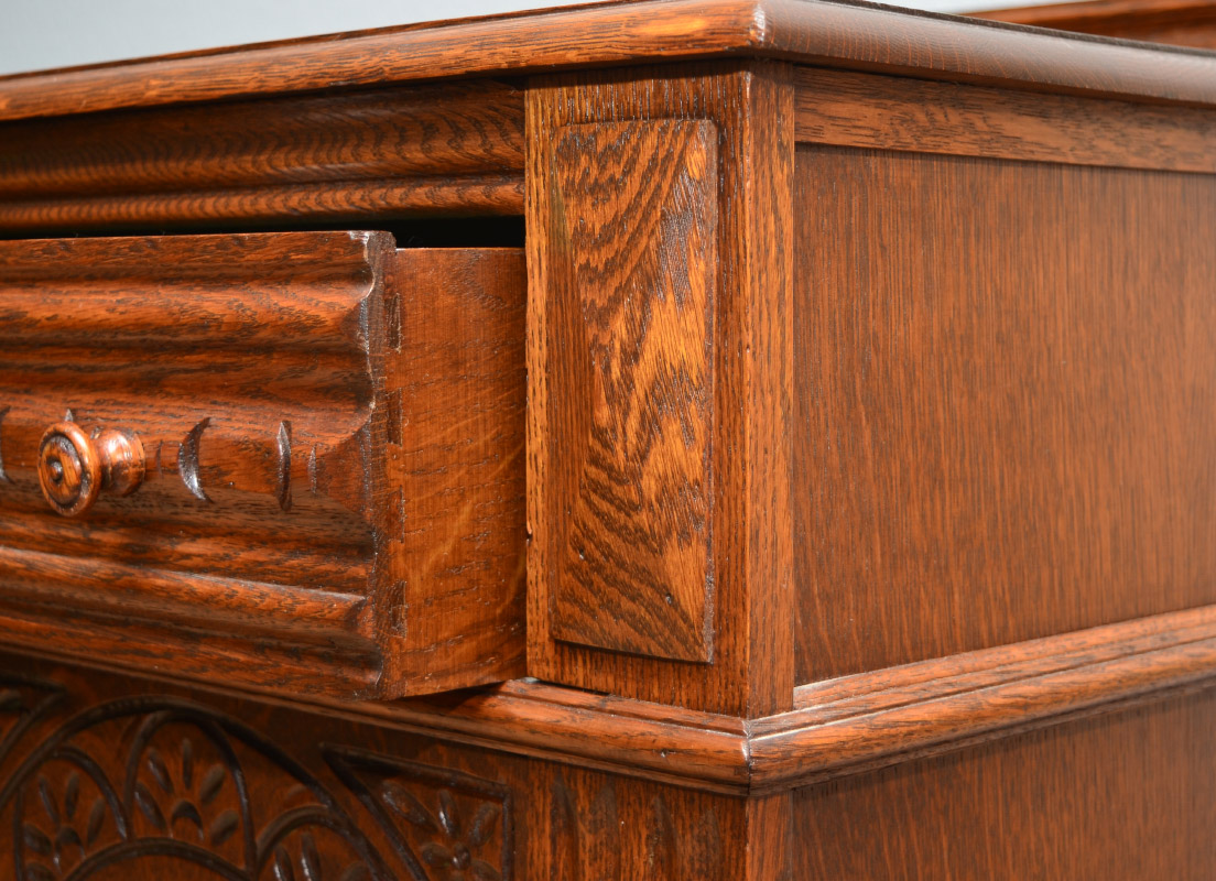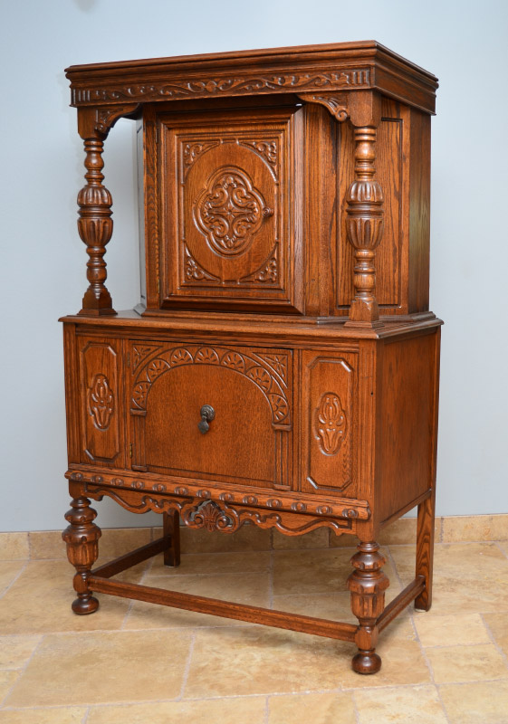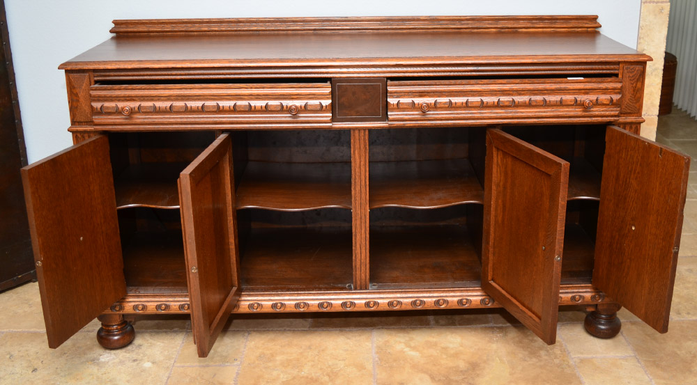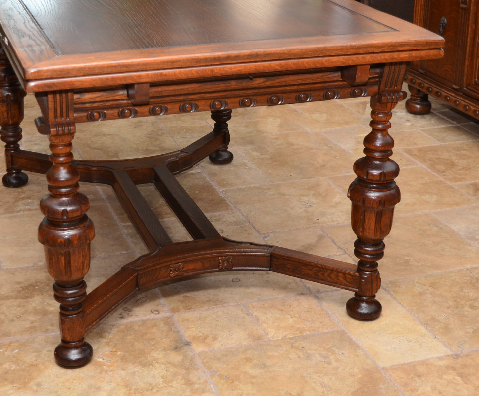 10 PIECE CARVED OAK DINING ROOM SET: 10 pieces total, all with carved decoration to include draw leaf dining TABLE, 31'' h. x 60'' x 38'', each draw leaf 17 3/4''; 6 CHAIRS with blue & silver pattered upholstery, single arm chair measures 45'' h. x 27 1/2'' x 22''; blind 2 door CUPBOARD with door over door, 63 1/4'' h. x 38'' x 19''; SIDEBOARD with 2 drawers over 4 doors, 38 1/4'' h. x 66'' x 20''; single door SERVER, 38'' h. x 38'' x 18''.