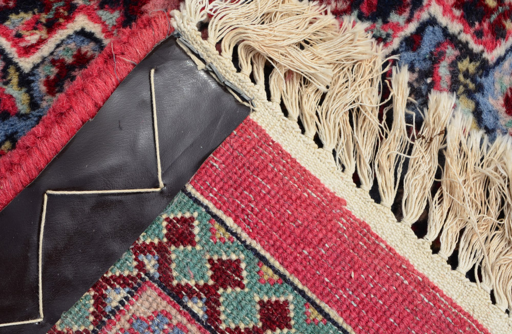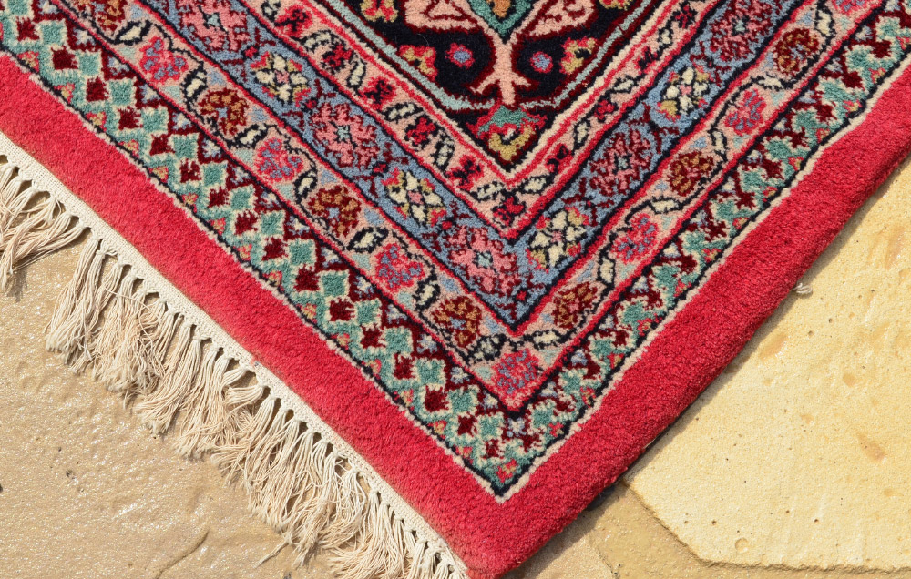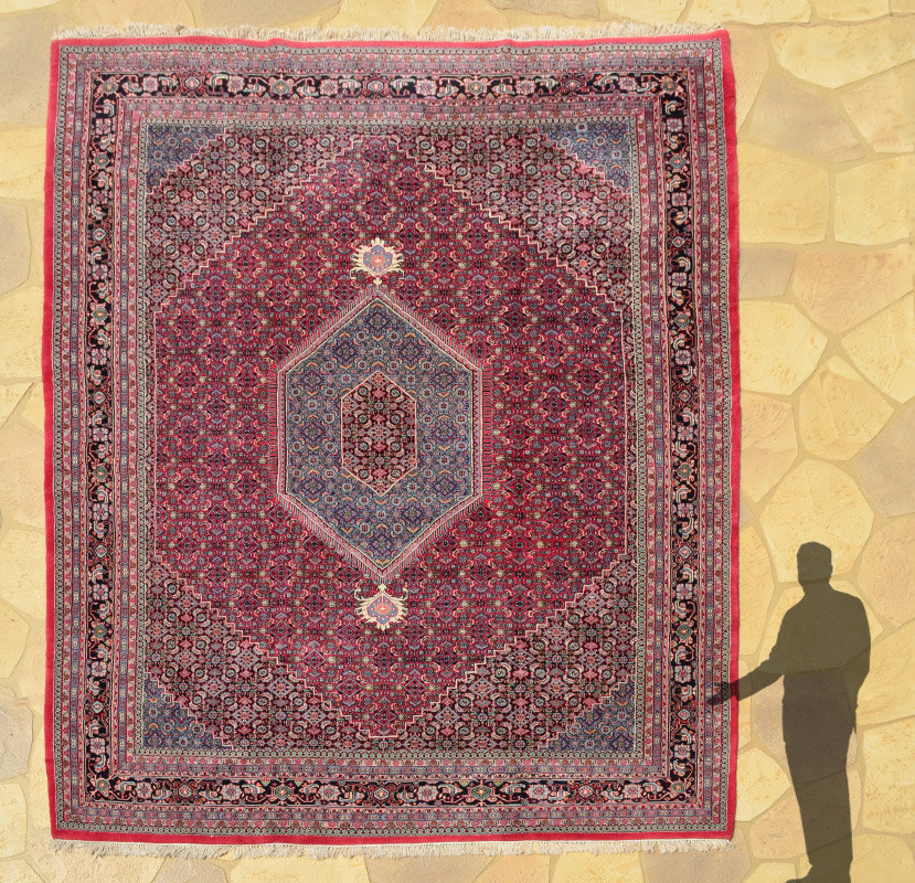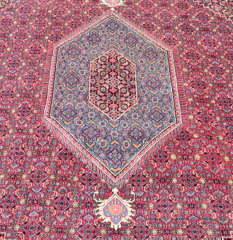 APPROX. 20-35 YR OLD INDO-PERSIAN HAND KNOTTED WOOL RUG, 10'2'' x 13'11'': This large room size rug is covered with a small repeating Herati type pattern from the large medallion within a medallion to the red ground field to the black and blue corners of the field, which repeat the colors of the medallions. The colors and intricate design work together to make an attractive, yet practical rug. Condition is good.
