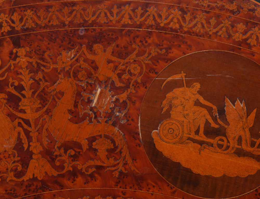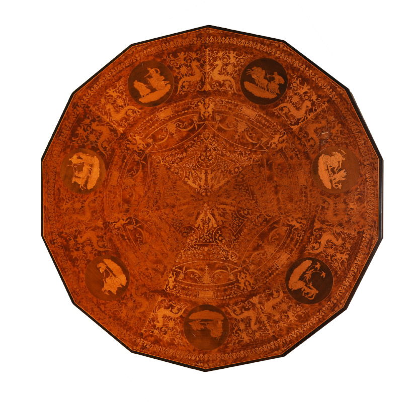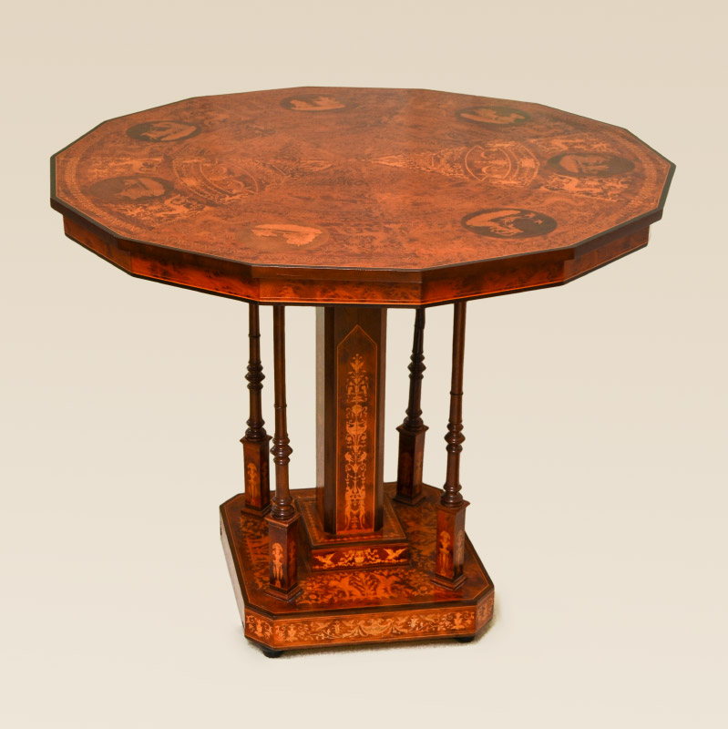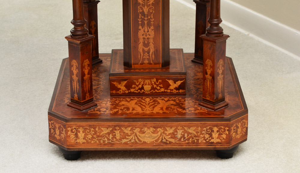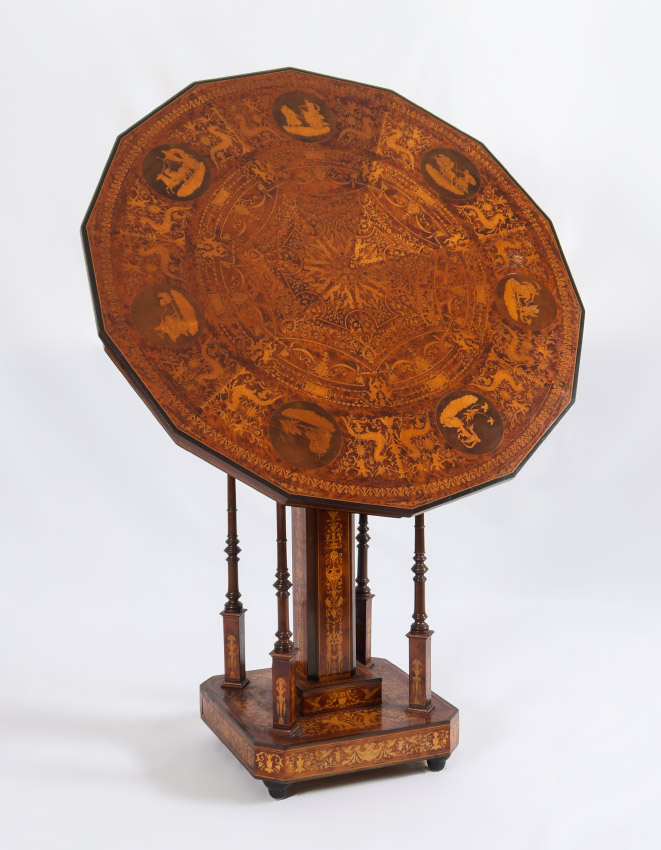 ITALIAN MARQUETRY INLAID TABLE: 20th century production, ornately inlaid all over with neo-classical and foliate motifs. 14 side flip top, body with center pedestal and 4 turned columns, square base with canted corners on 4 feet. Overall measures 32'' h. x 35 1/4''.