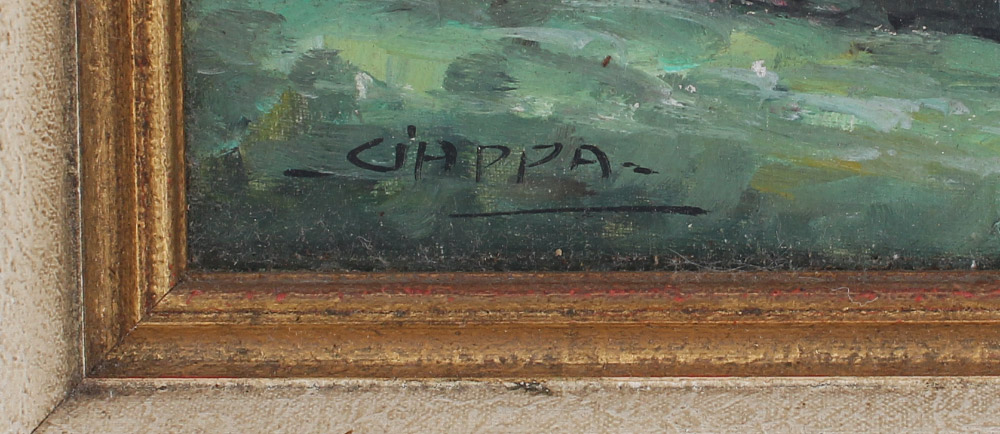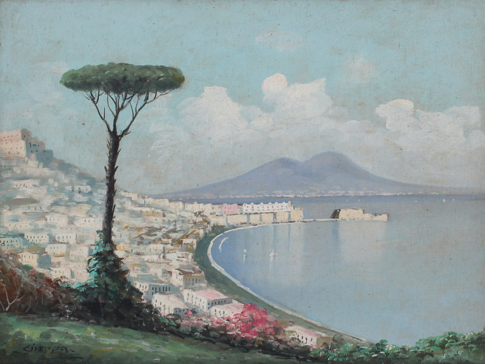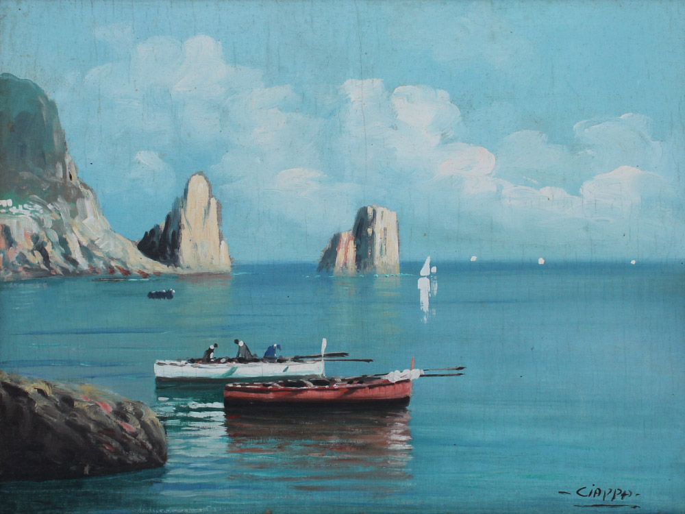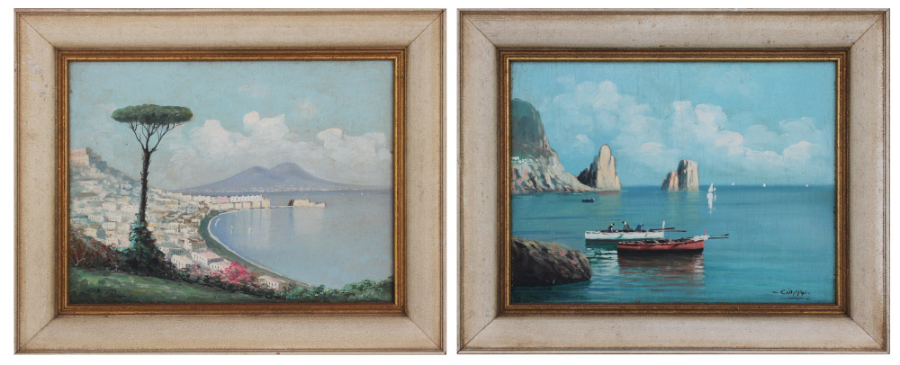PAIR OF CIAPPA ITALIAN PAINTINGS: 1.) Bay of Naples with Vesuvius in the Distance, Oil/Canvas Board, 12'' x 16'', signed lower right, framed 16'' x 20''. 2.) Fishing Boats Off the Italian Coast, probably Amalfi, Oil/Canvas Board, 12'' x 16'', signed lower right, framed, 16'' x 20''.