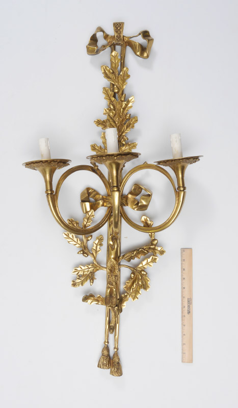 3 LIGHT BRASS SCONCE: Electric, ribbon and foliate motif, overall measures 36 1/2'' h. x 17 1/2'' x 10''.