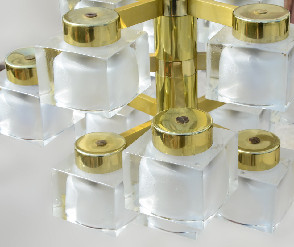 GAETANO SCOLARI FOR LIGHTOLIER CHANDELIER: 13 lights on 3 levels with lower central light, on brass frame, heavy square frosted and clear glass shades. Overall measures 31'' h. x 22 1/2''. Lightolier label inside ceiling cap.