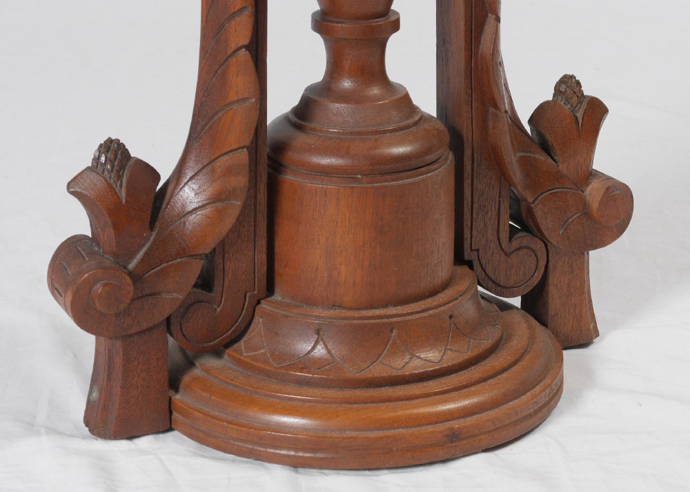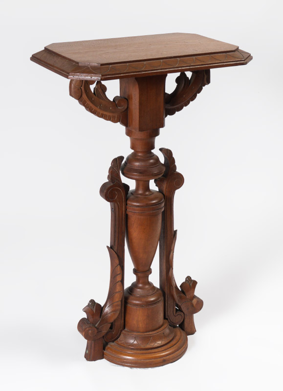 VICTORIAN CARVED WALNUT PEDESTAL: Rectangular top with canted corner, scroll supports, turned pedestal body with applied carved decoration either side. Overall measures 33 1/4'' h. x 20'' x 14''.