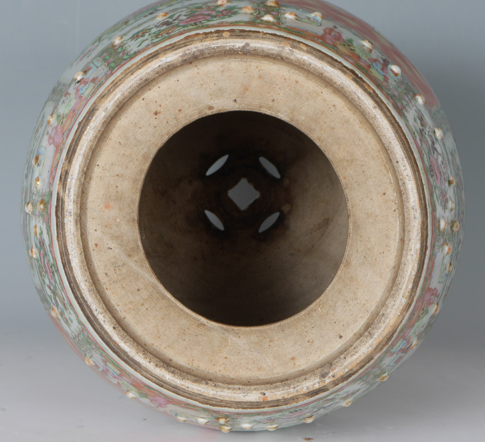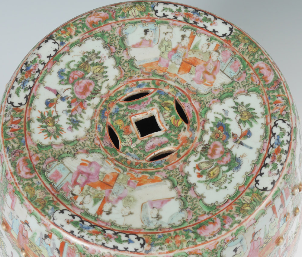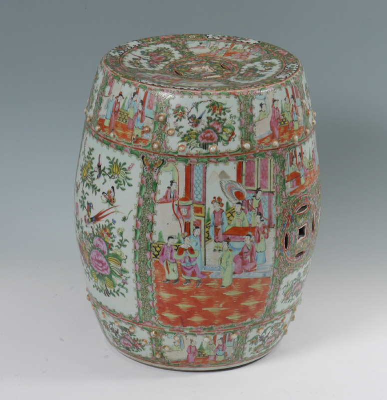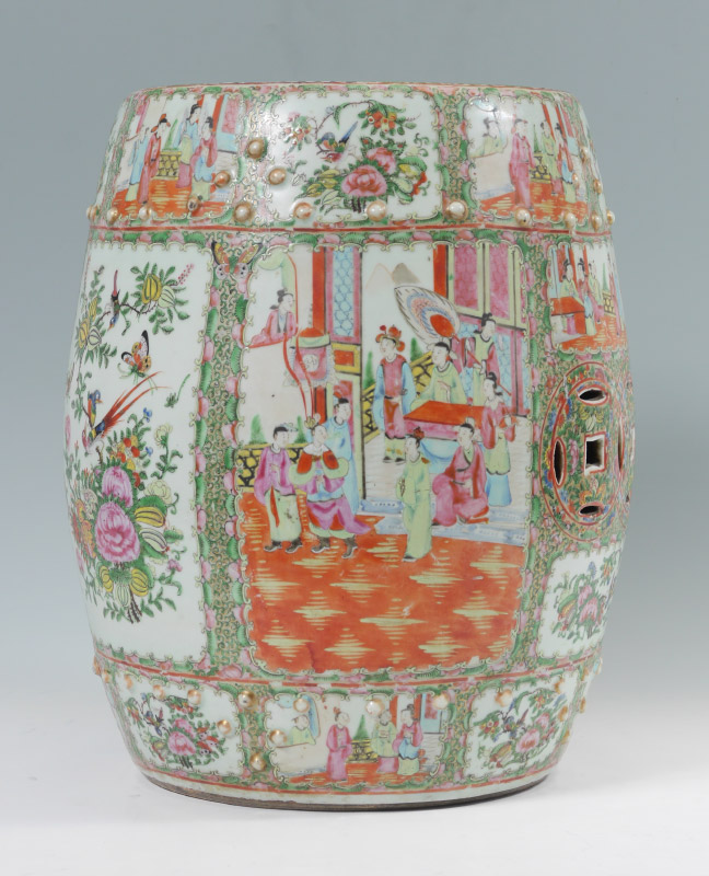 CHINESE ROSE MEDALLION GARDEN SEAT: Pierced top and sides, genre scenes and floral decoration in alternating reserves, raised buttons. Unmarked, overall measures 18 1/4'' x 14 3/4'' dia.