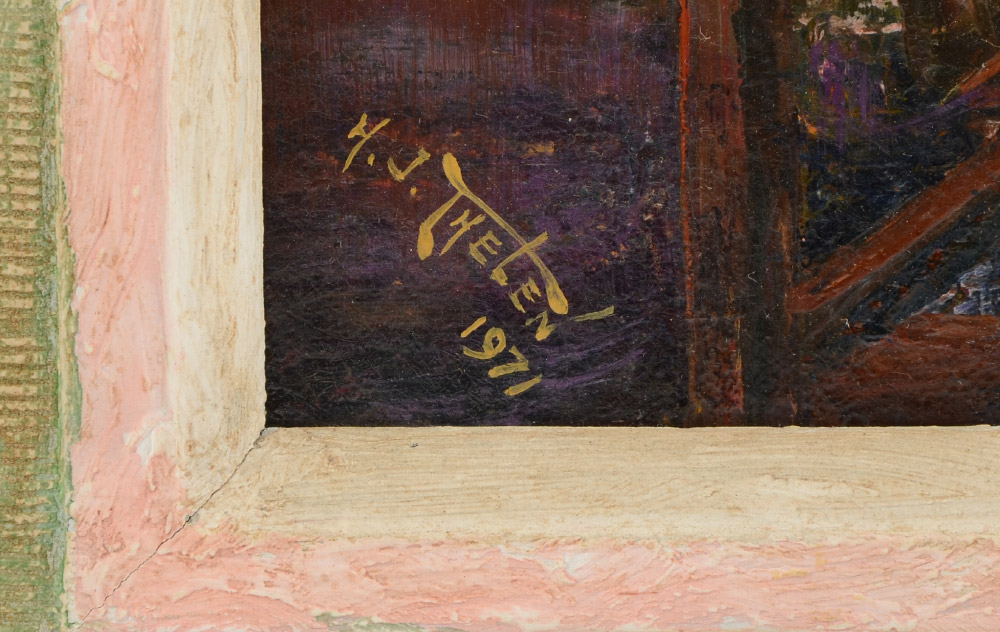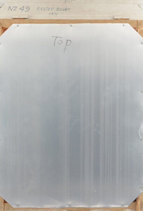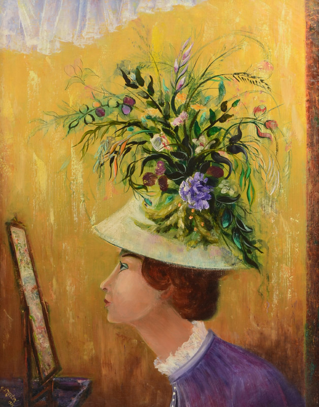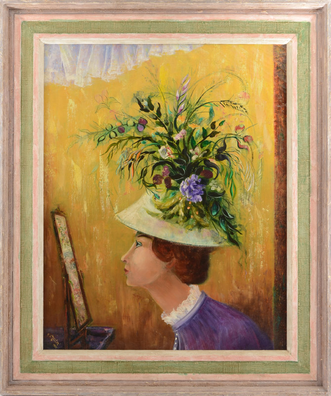 THELEN, Hubert J., (American, 20th Century): ''Easter Bonnet'', Oil/Canvas, 30'' x 24'', signed lower left and dated 1971, numbered on the custom frame verso, 49 and titled ''Easter Bonnet'' 1941, framed 38'' x 32''. #49 From the Artists Raisonne, in his words, ''EASTER BONNET, 24X30, 1971 A fantasy, painted in my Brooklyn studio without model or props. The frame was made and designed by me from lumber and yard moldings.''