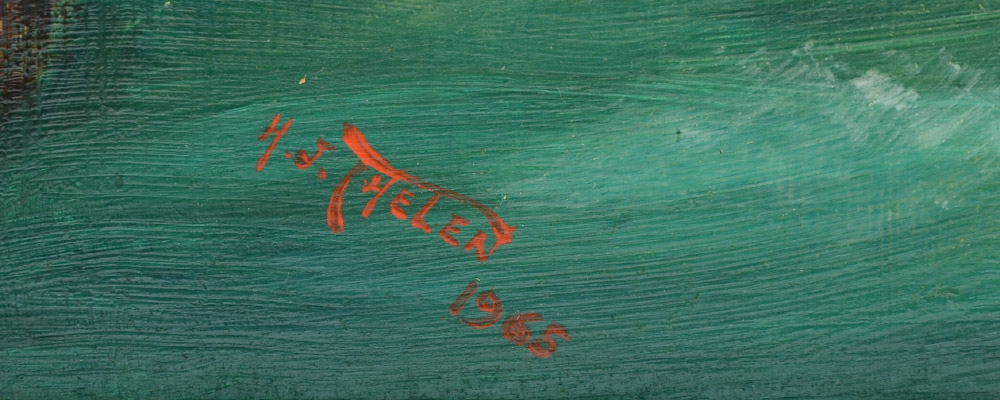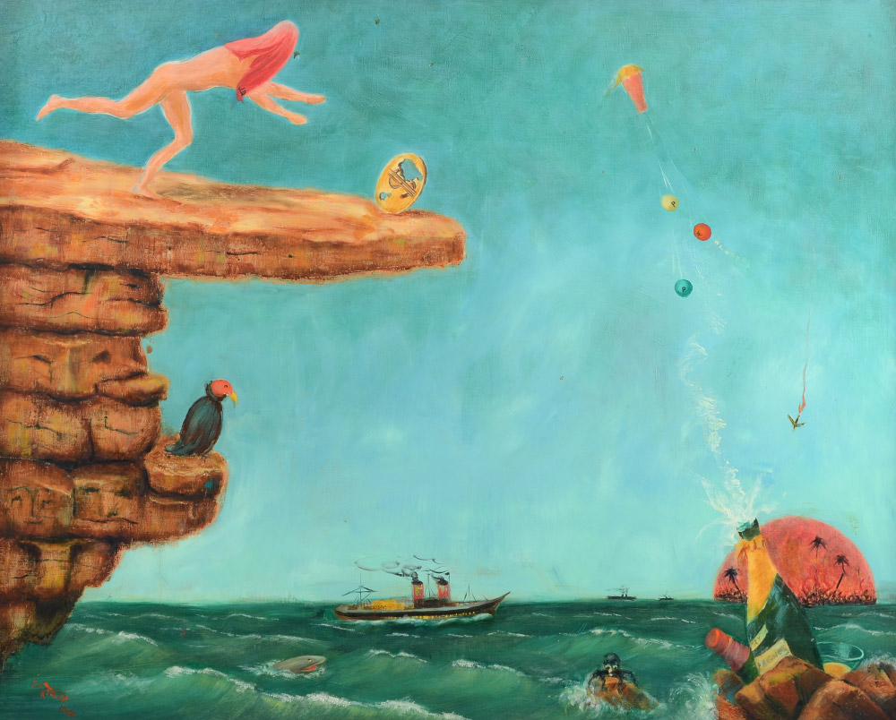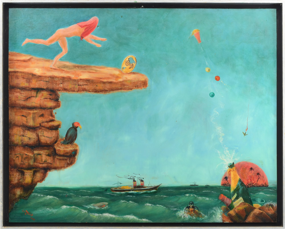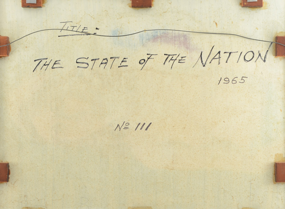 THELEN, Hubert J., (American, 20th Century): ''The State of the Nation'', Oil/Board, 24'' x 30'', signed lower left, dated 1965. Titled, dated, and numbered 111 on verso, encased in custom extruded aluminum frame, 25 1/2'' x 31 3/4''. #111 From the Artists Raisonne, in his words, ''STATE OF THE NATION, 24X30, 1965 Executed during the term of office of the late president, Lyndon Johnson. In the upper left corner we have a running figure blind-folded by a towel containing the initials J.D. for John Doe. John Doe is running on top of the heavy rock of inflation after a dollar which has two holes in it, implying the declining purchasing power of the dollar. The rock of inflation is bearing heavily upon the smaller rocks below, depicting the faces of widows, orphans, and people with fixed income. On one of the smaller rocks sits a vulture waiting patiently for John Doe. In the water below, we have a shark from Russian waters, as well as a Cuban octopus waiting to join the vulture to devour John Doe. In the center, a ship loaded with gold is leaving the country. The lower right corner portrays, in a half-circle, the burning jungle of Vietnam with a plane falling down in flames. In front of it, champagne bottles are being cooled for the war profiteers. The champagne cork has popped and is going into orbit and pulling up three small balloons marked ''P'' for profit; ''W'' for wages, and ''P'' for prices. The frame was made and antiqued by me.''