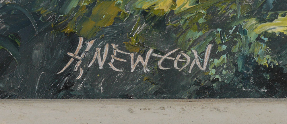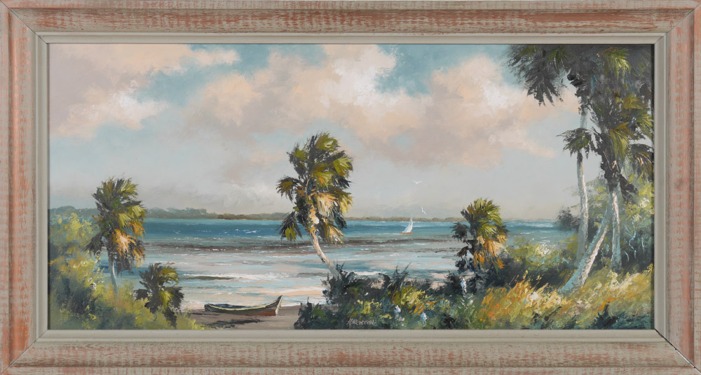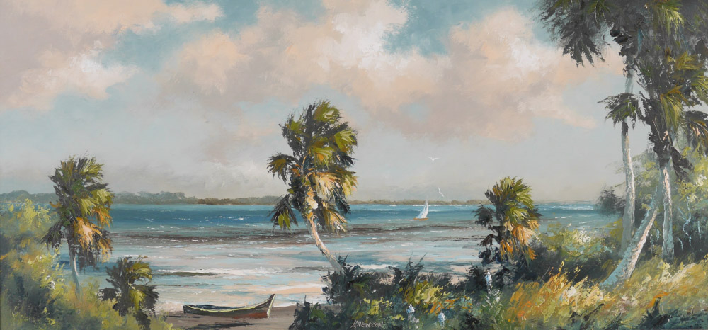 NEWTON, Harold, (American, 1934-1994): Florida Highwaymen Indian River scene with boats, birds and palm trees, Oil/Masonite, signed lower center, 16'' x 33'', framed 37 1/2'' x 20''.