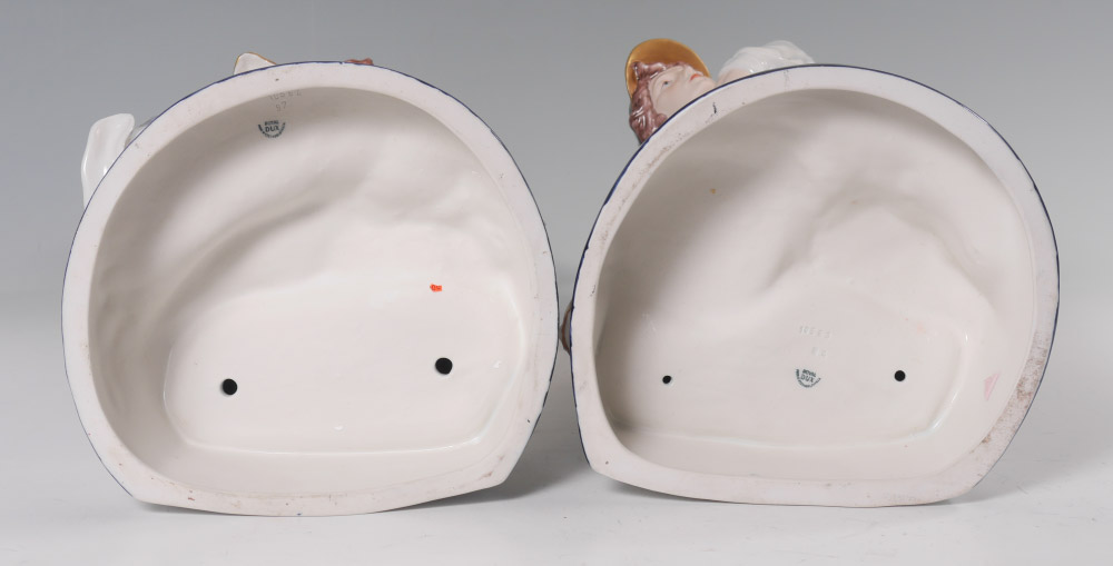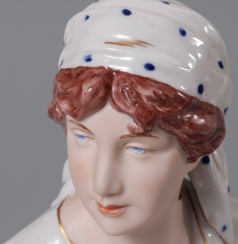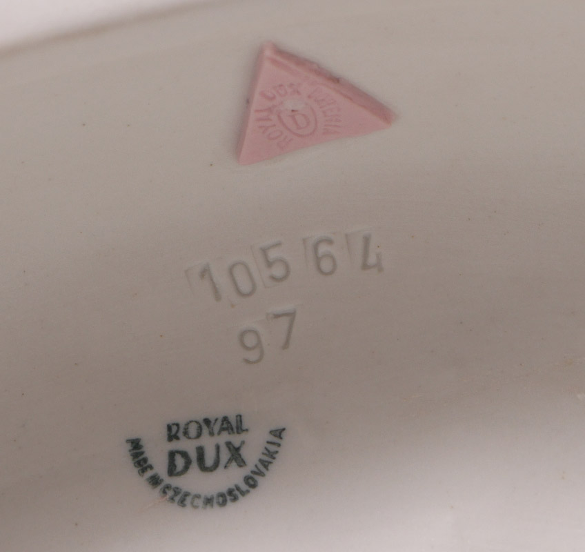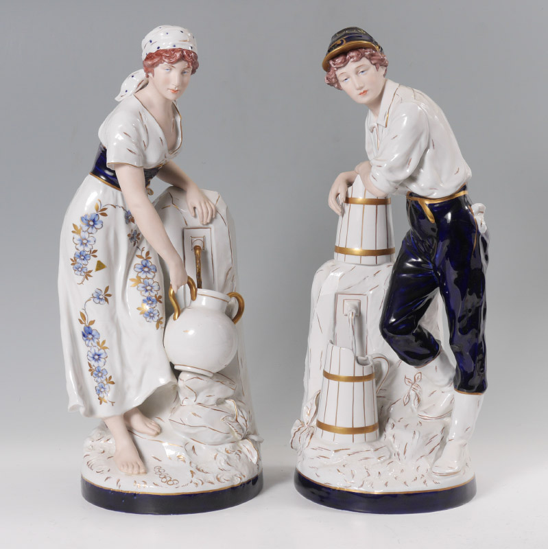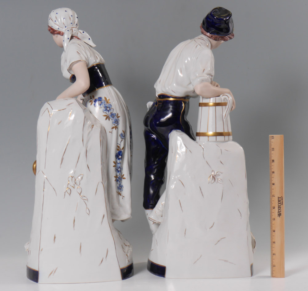 PAIR ROYAL DUX PORCELAIN FIGURES: 13.5'' tall, cobalt gold on white. Pink triangle on underside.