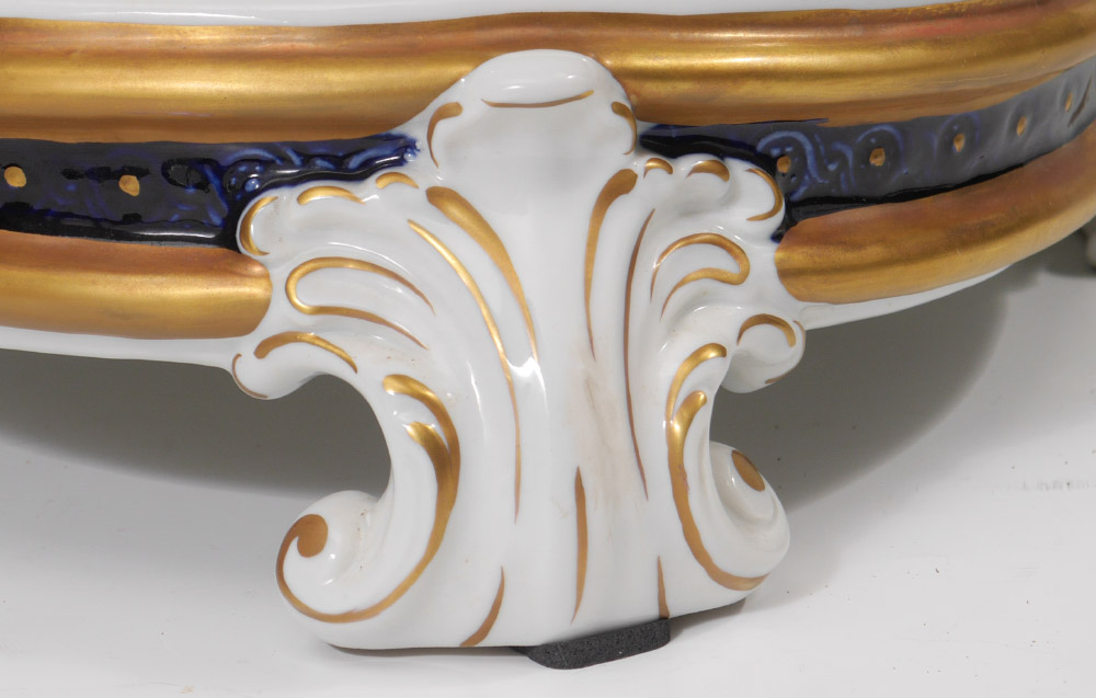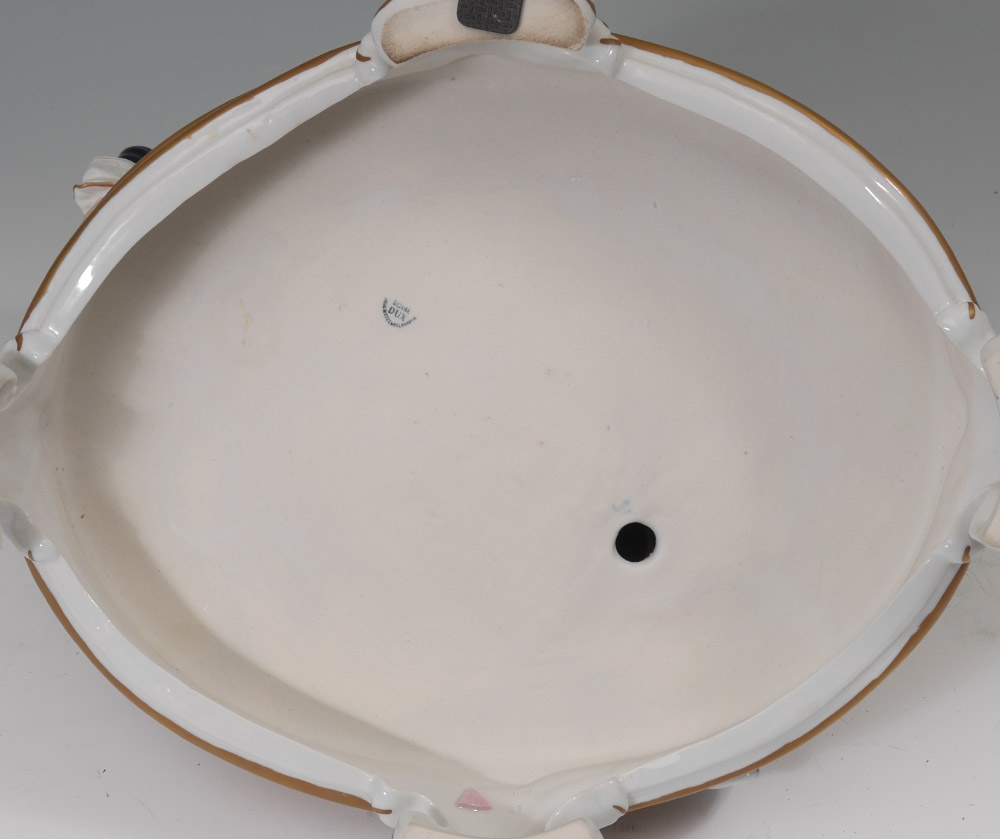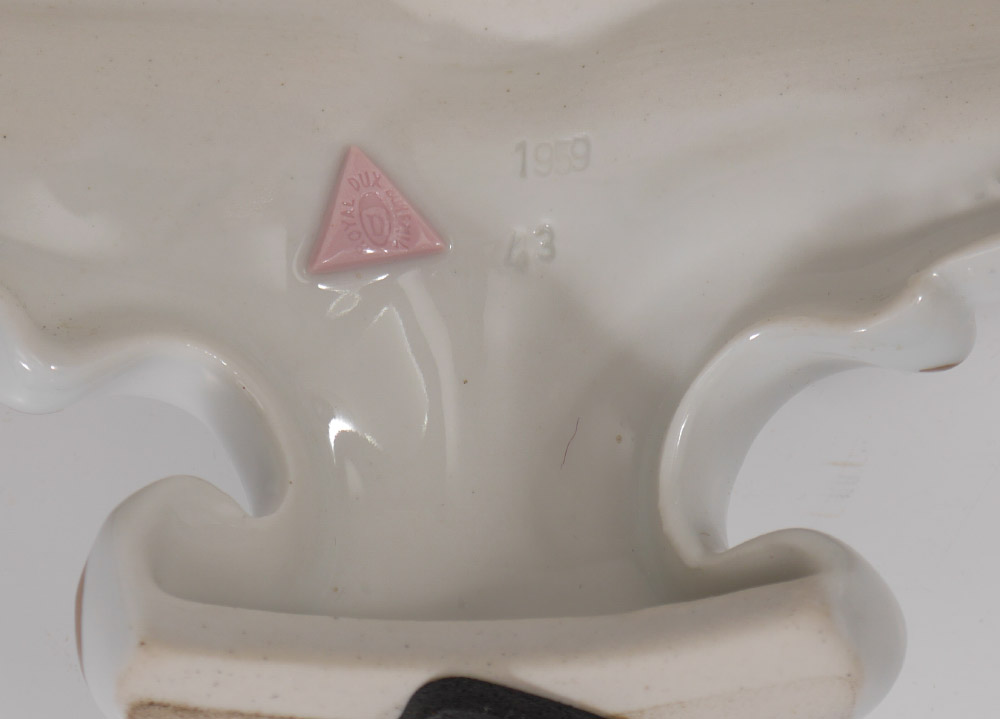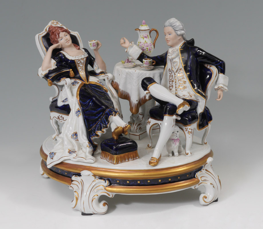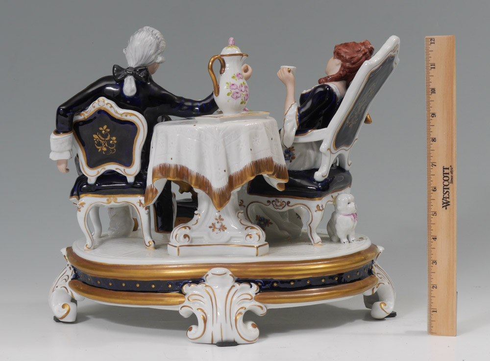 ROYAL DUX PORCELAIN FIGURAL GROUP: Figures of finely dressed man and woman seated for tea, Royal Dux ink stamp and pink triangle on base, overall measures 12 1/4'' h. x 14'' x 13''.