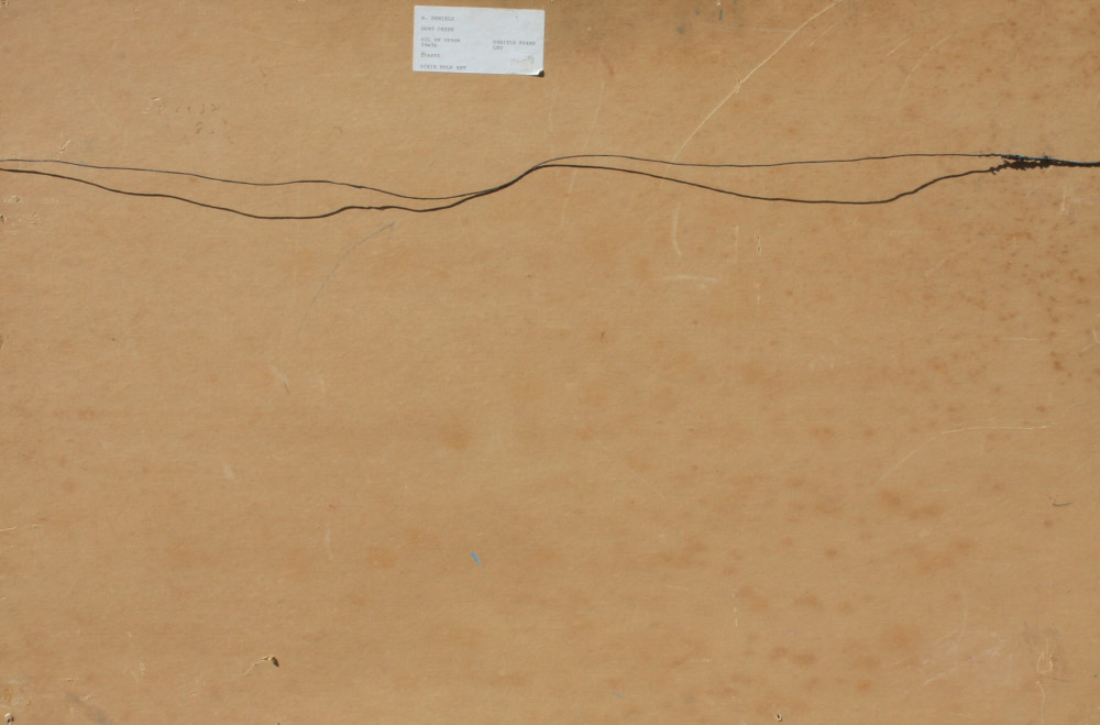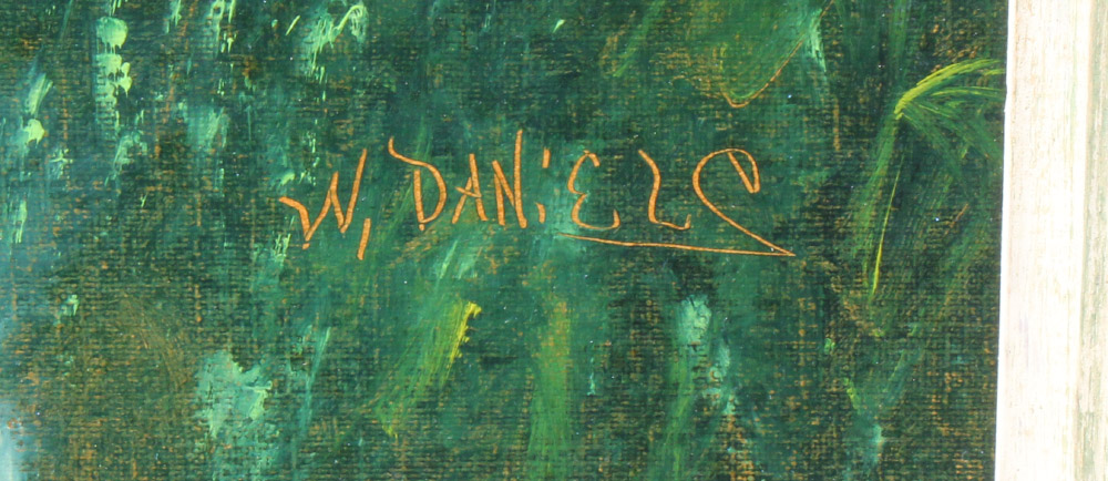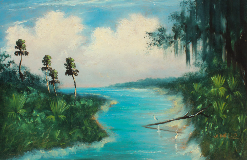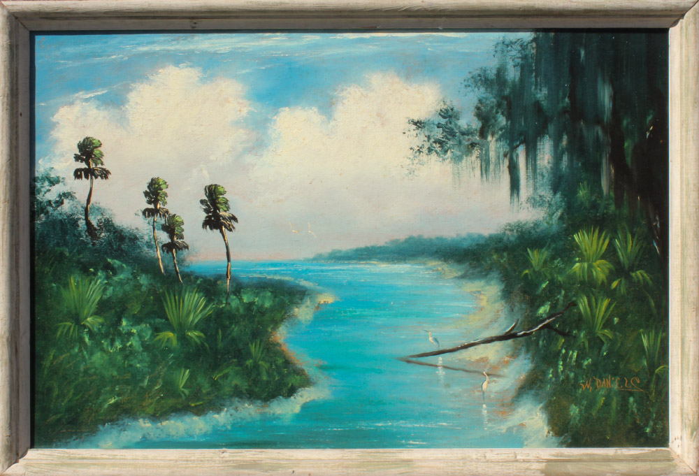 DANIELS, Willie, (American, 20th Century): Goat Creek Backwaters scene, Oil/Upson, old Dixie Folk Art gallery label on back, signed lower right, 24'' x 36'', framed 26'' x 38''.
