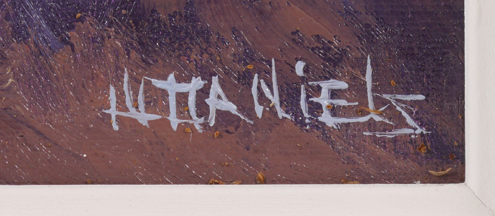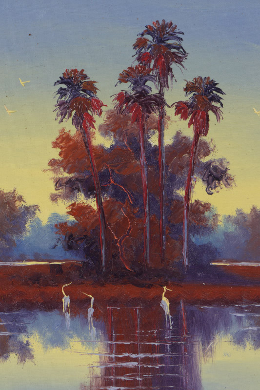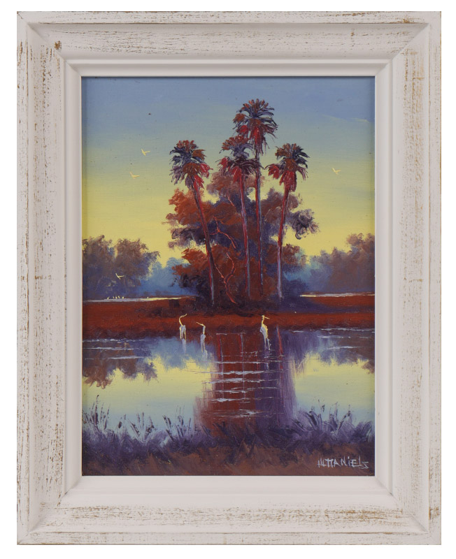 DANIELS, Willie, (American, 20th Century): Florida Highwaymen Backwater Landscape with Palm Trees and Birds, Oil/Canvas Board, 16'' x 12'', framed 19 1/2'' x 15 1/2''.