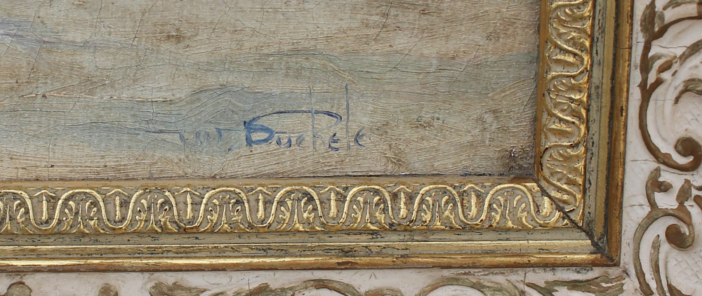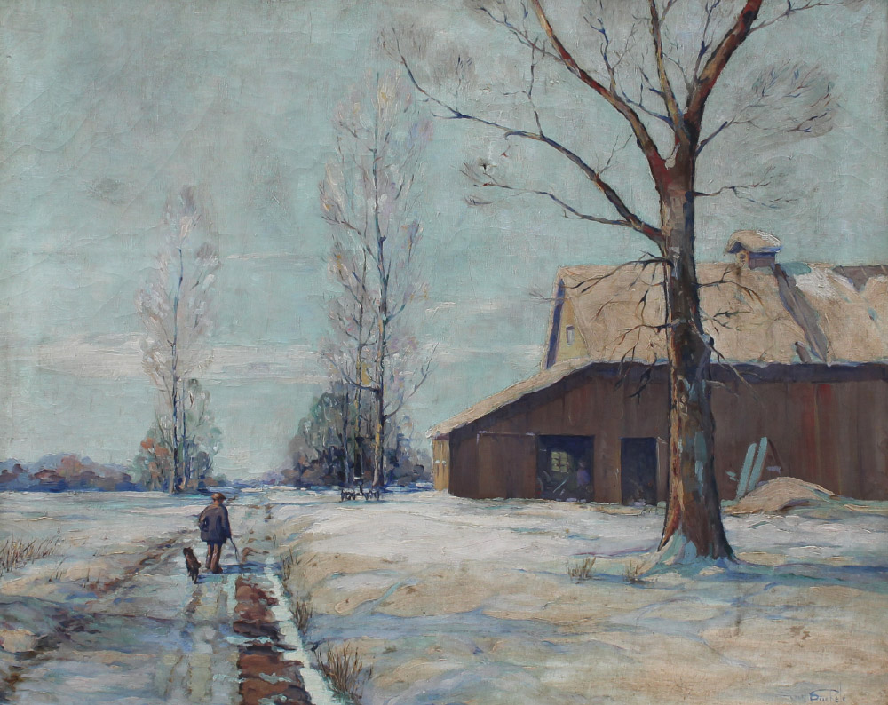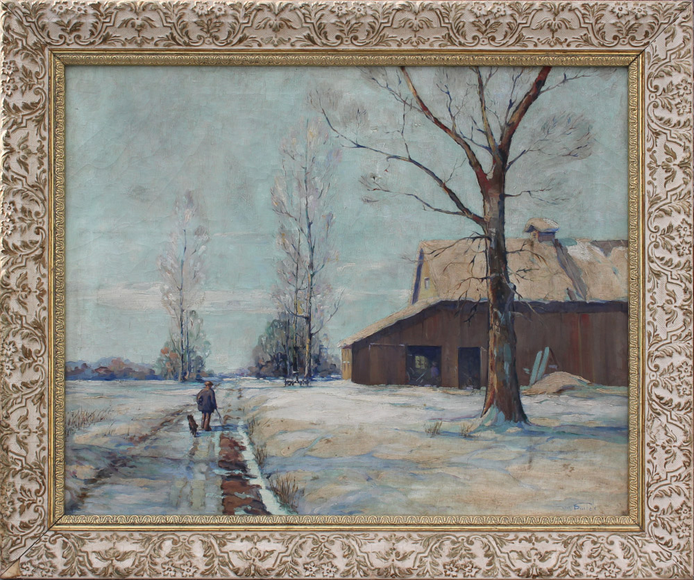 GOOD WINTER IMPRESSIONIST PAINTING SIGNED BUCHELE: Oil/Canvas, 24'' x 30'', signed lower right, carved and painted frame, 30'' x 36''. Scene depicting a man and his dog traveling along a snowy winter trail.