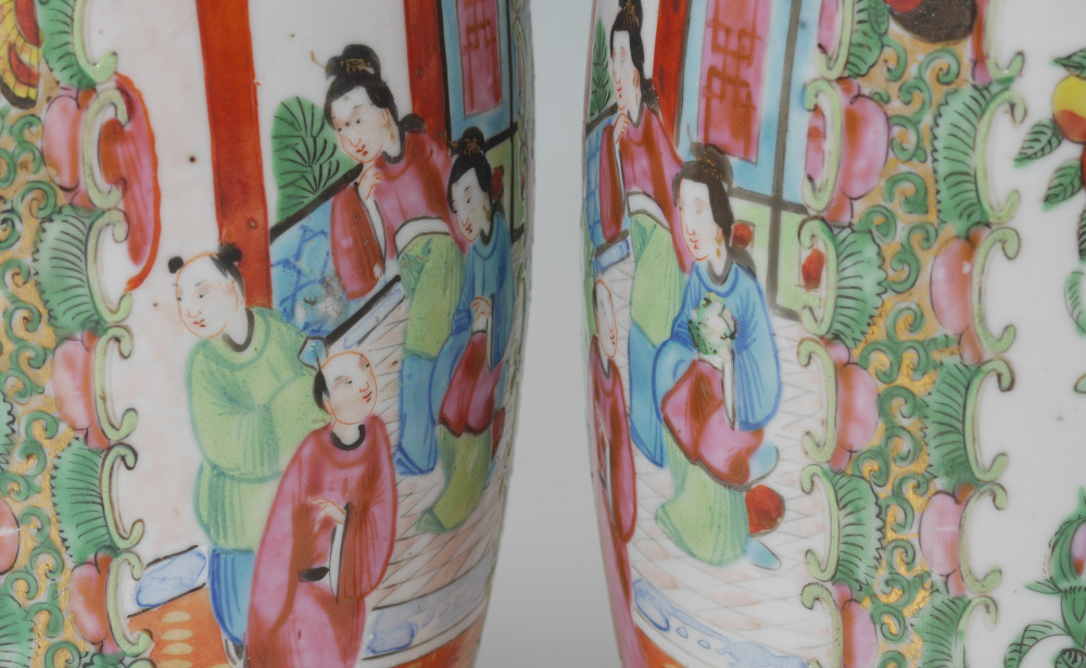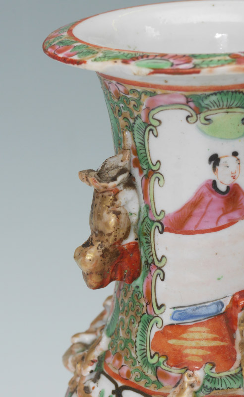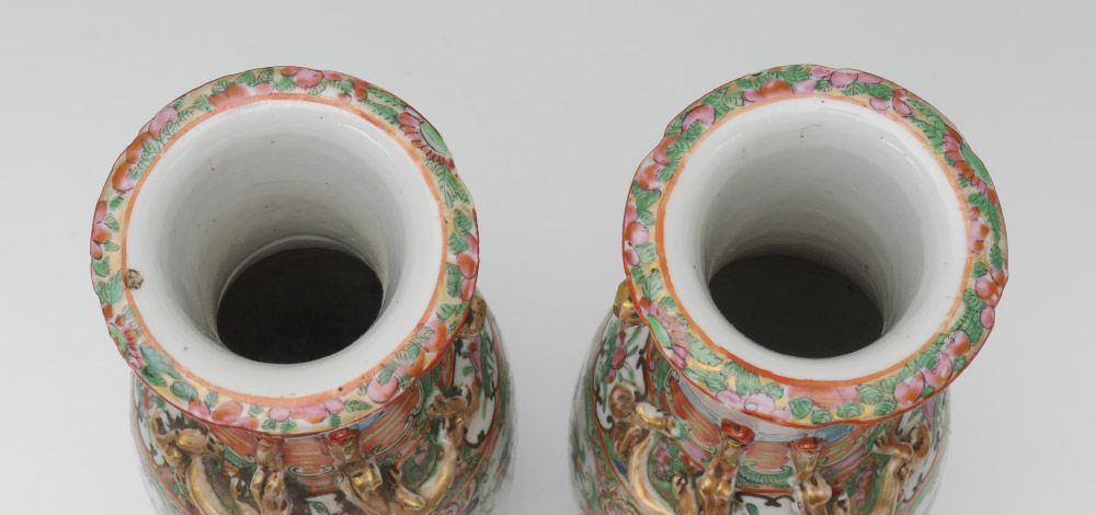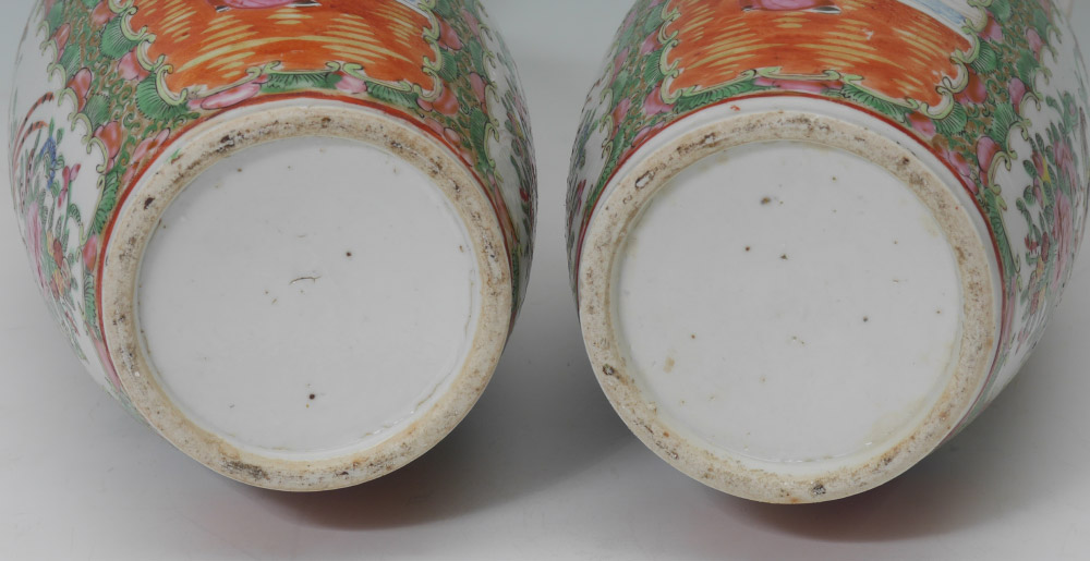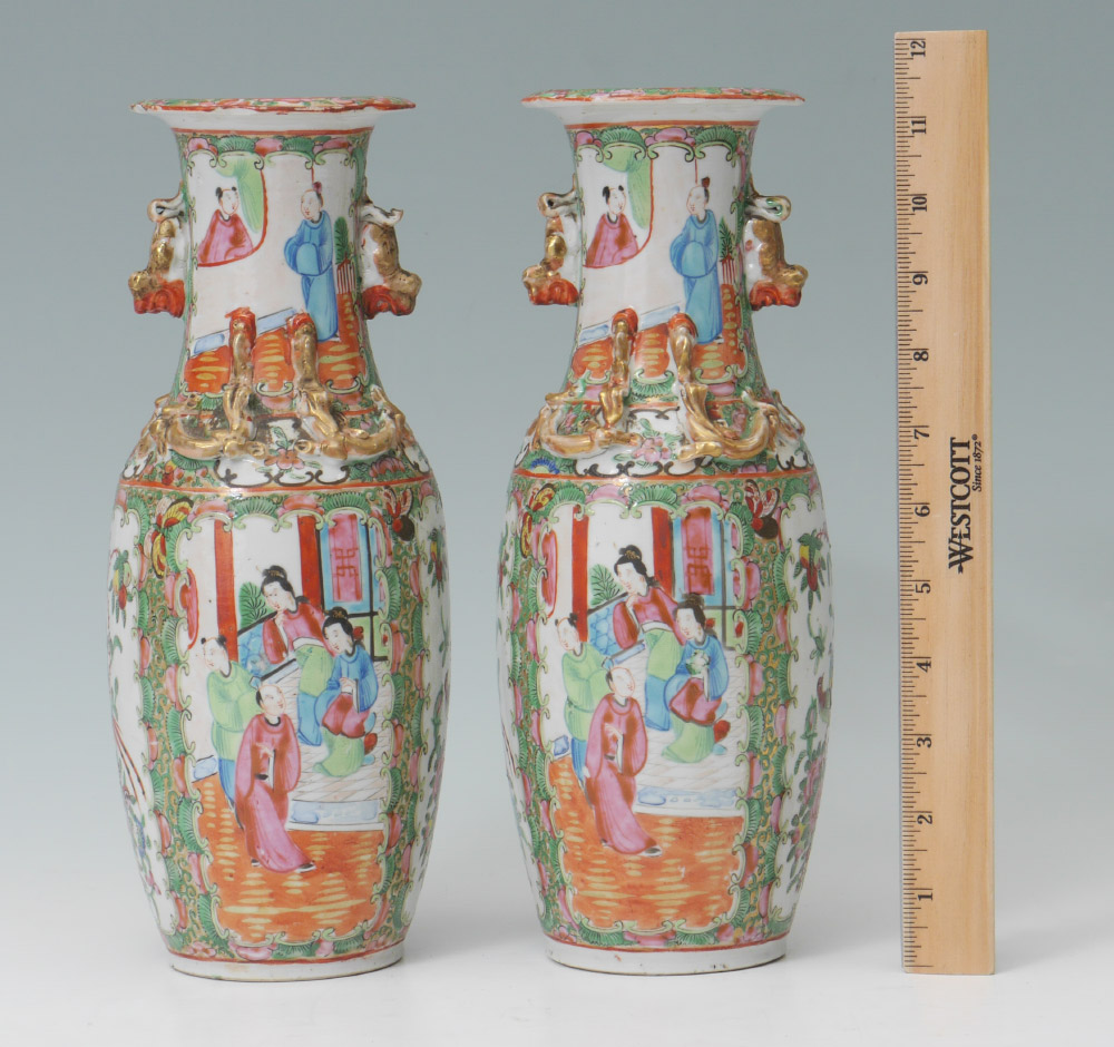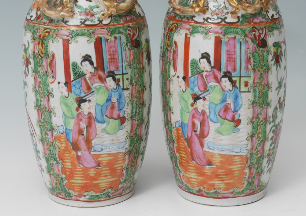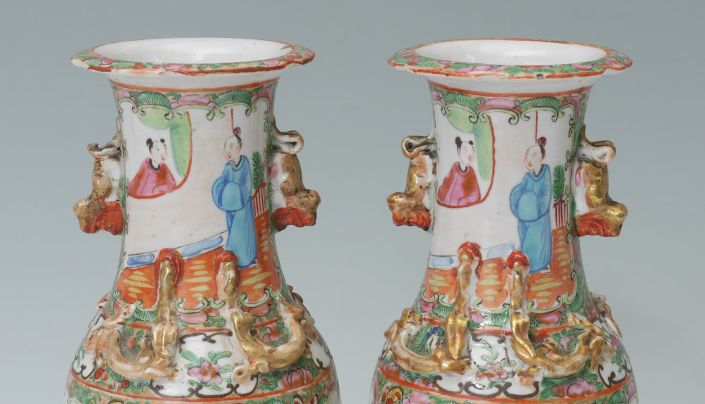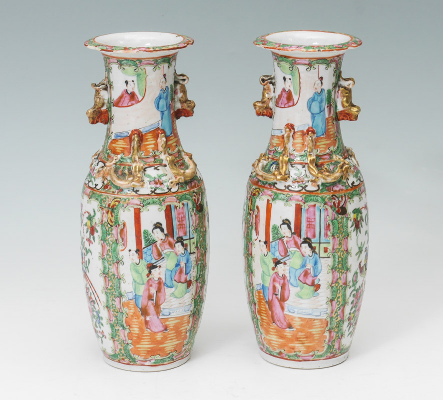 PAIR CHINESE ROSE MEDALLION VASES: Matched baluster form pair with identical genre scenes in reserves, applied handles, unmarked, approx. 11 1/2'' h. x 4 1/2''.