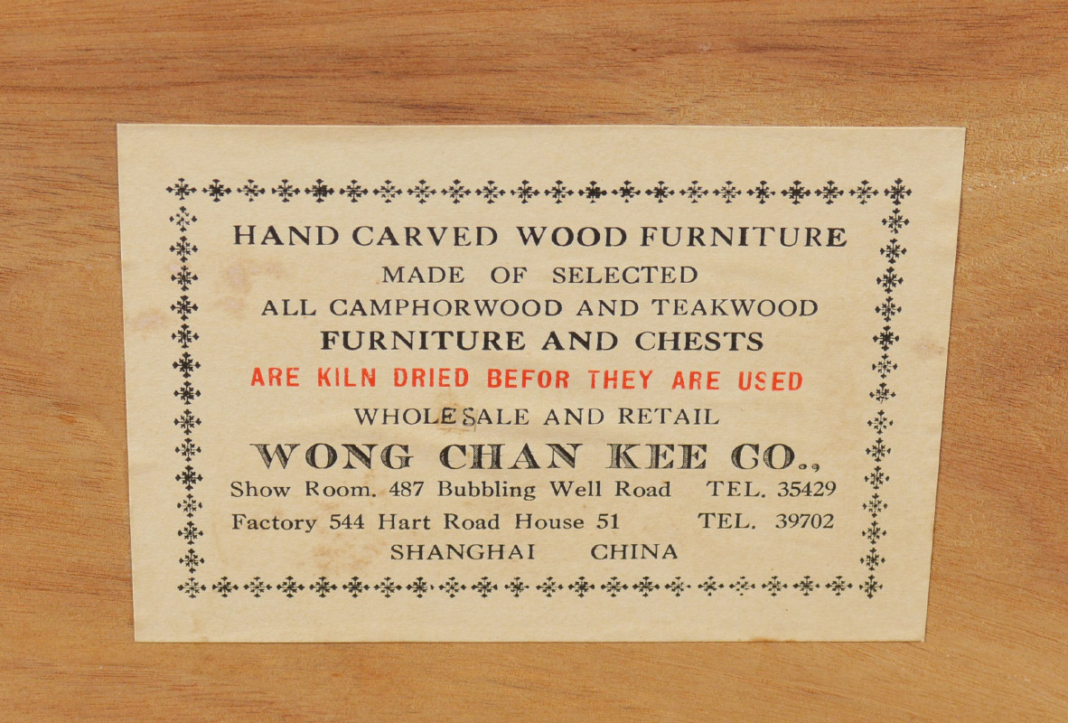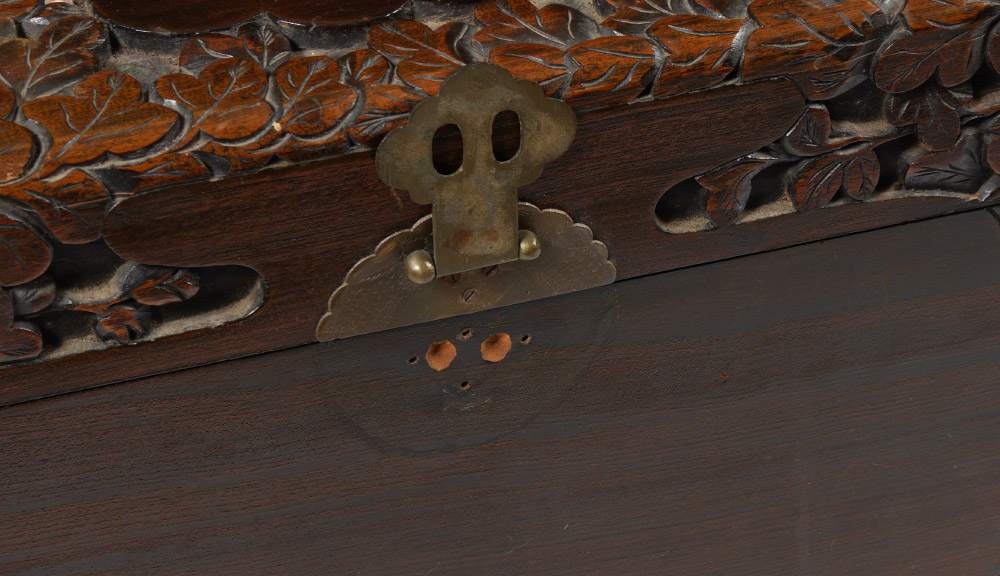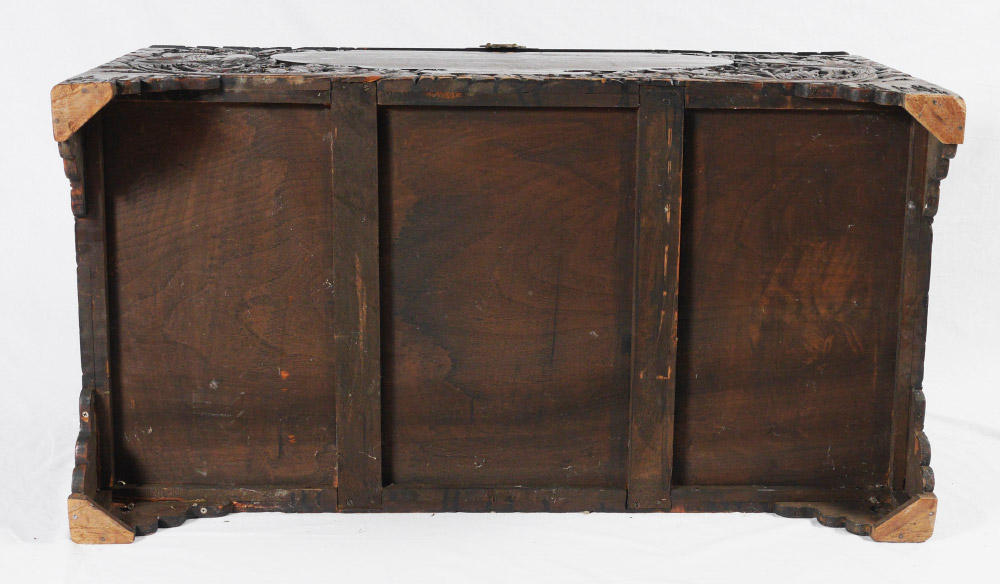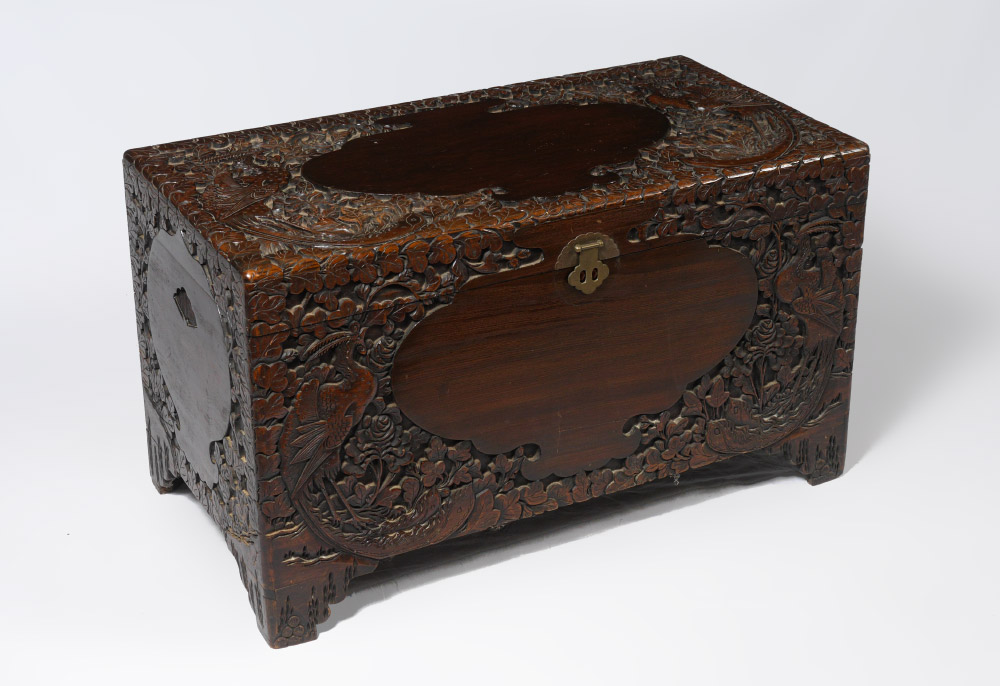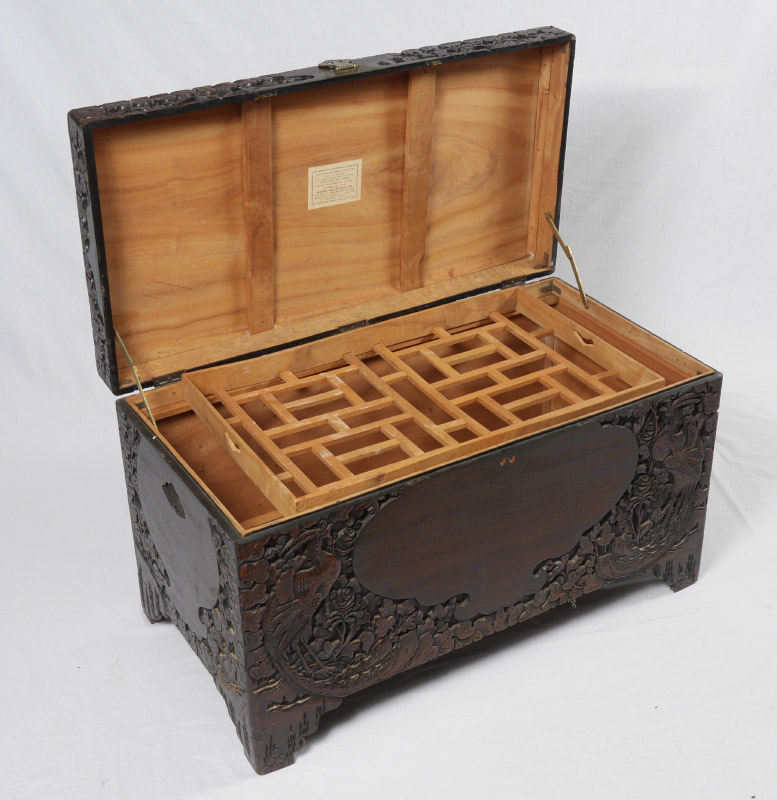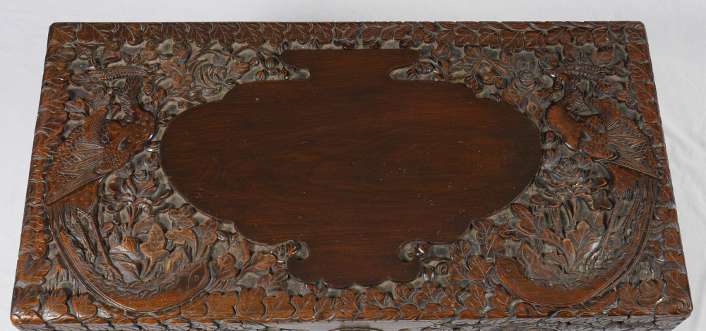 CARVED CHINESE STORAGE CHEST: Profusely carved all over with peacock, floral and foliate motifs. Hinged lid, interior with fitted tray, all on 4 legs. Overall measures 23 1/4'' h. x 40'' x 21''.