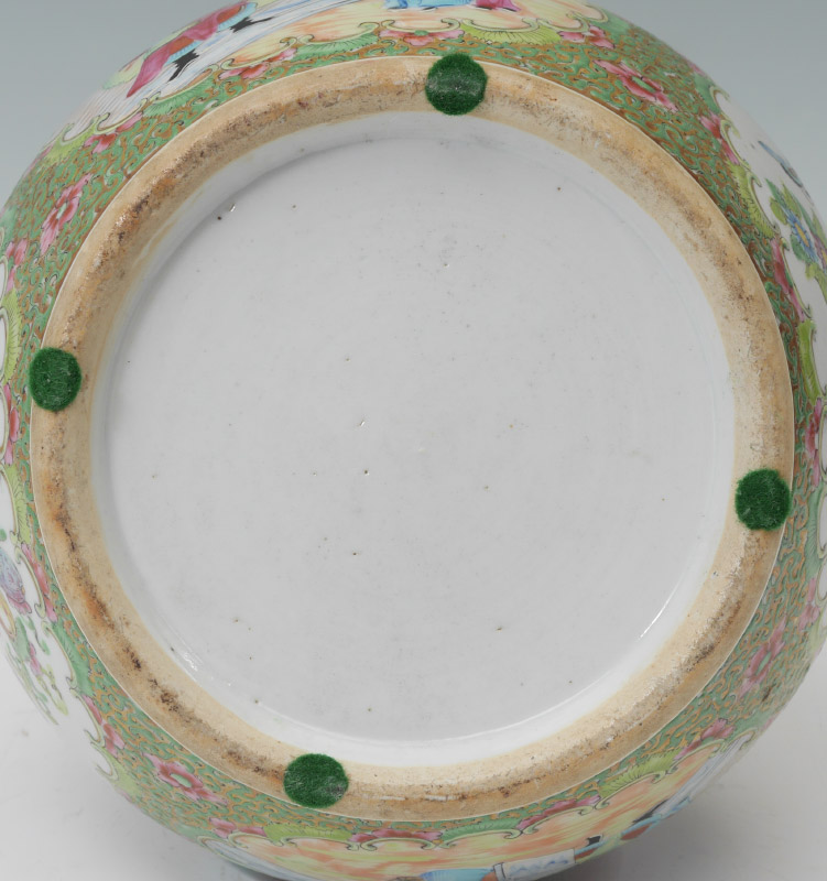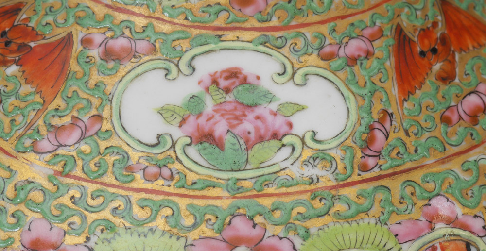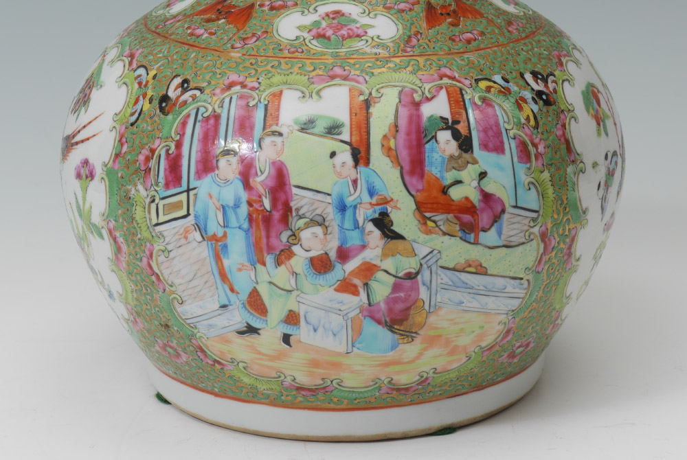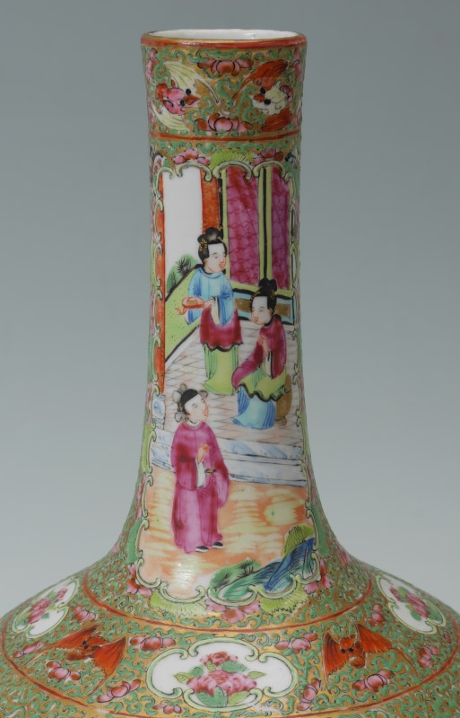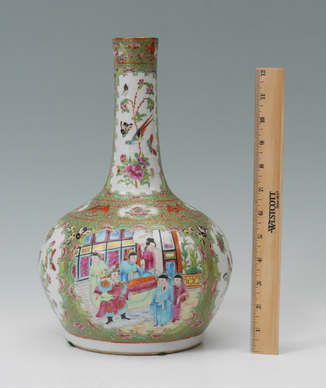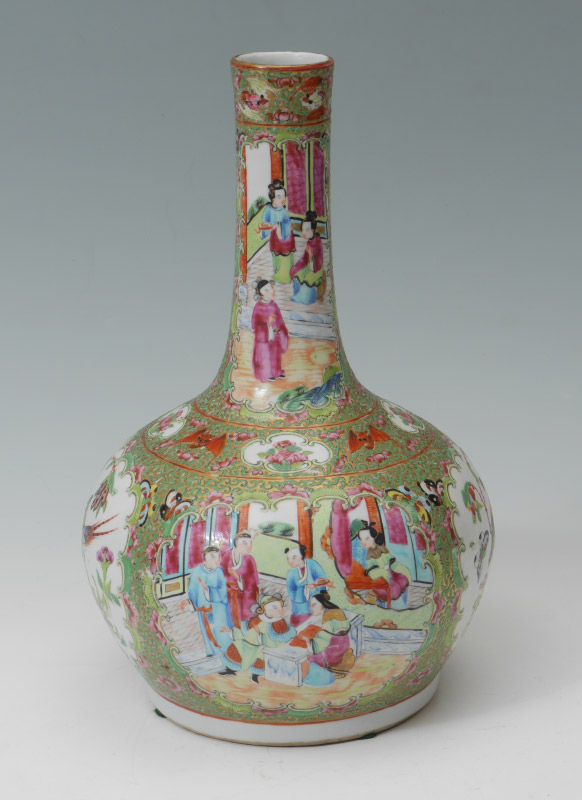 CHINESE ROSE MEDALLION VASE: Elongated neck and bulbous body with genre scenes in reserves, bats in floral decoration, unmarked, measures 13 1/2'' h. x 8 1/2''.