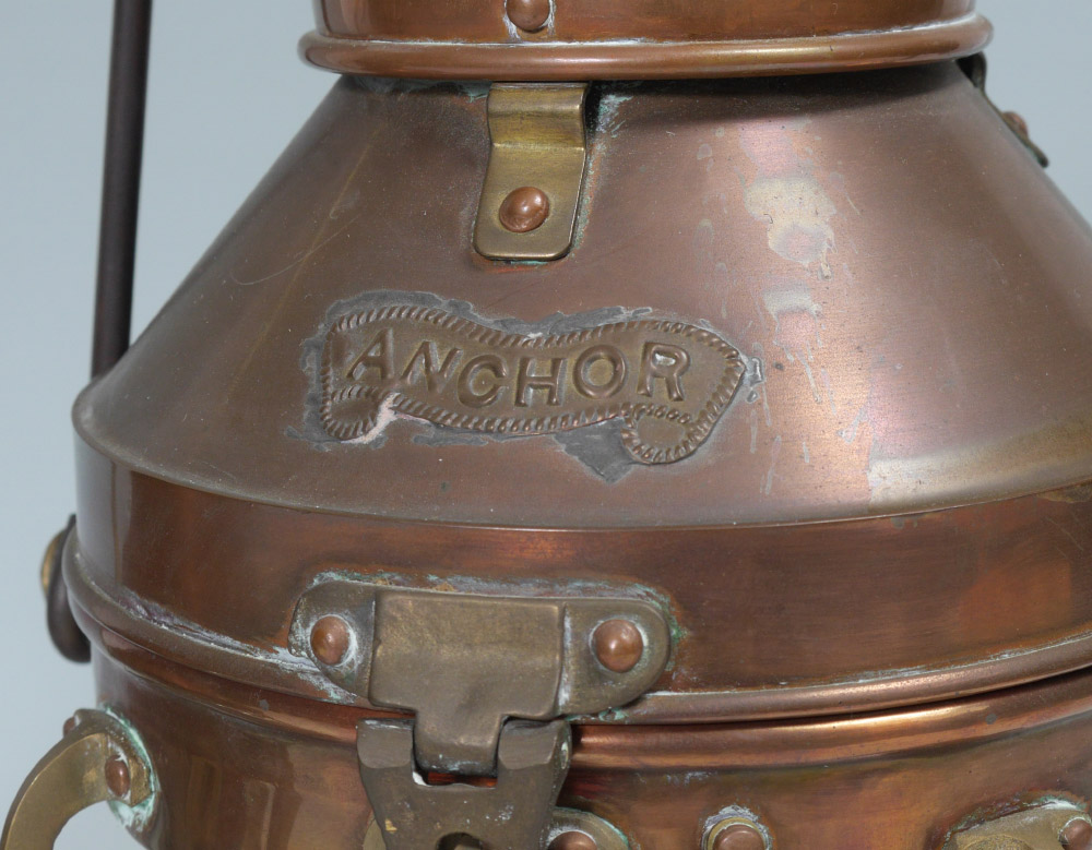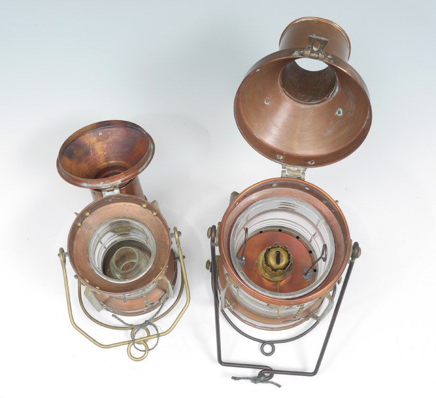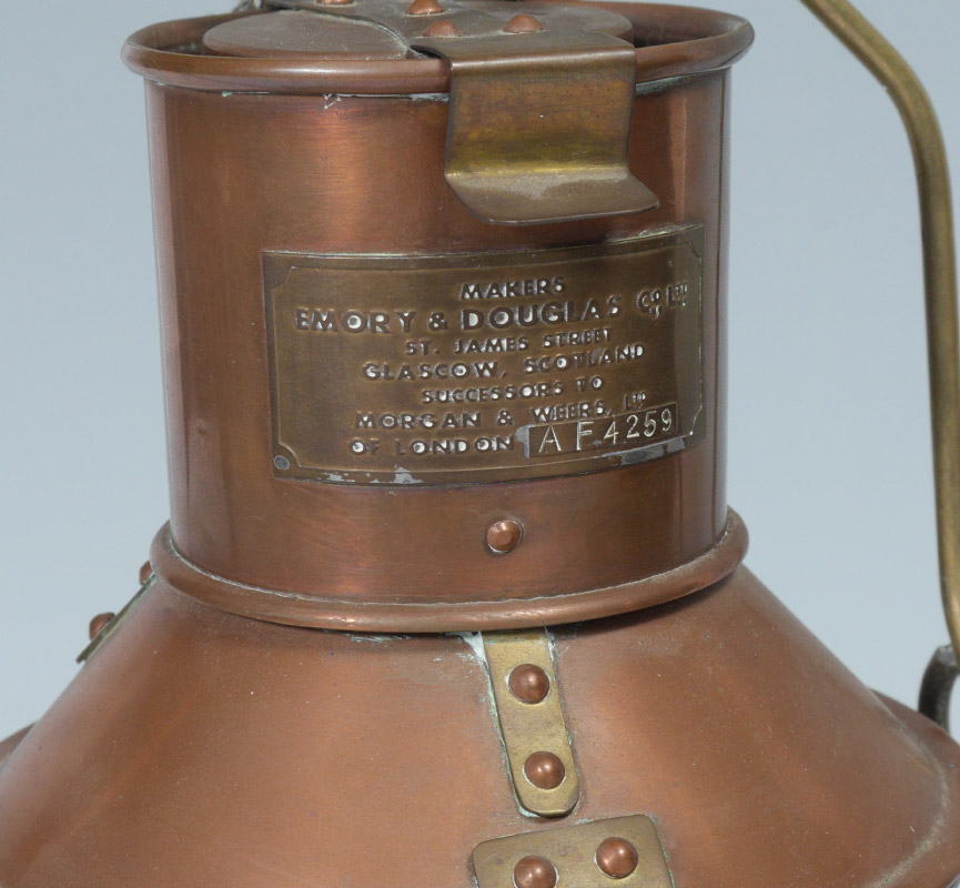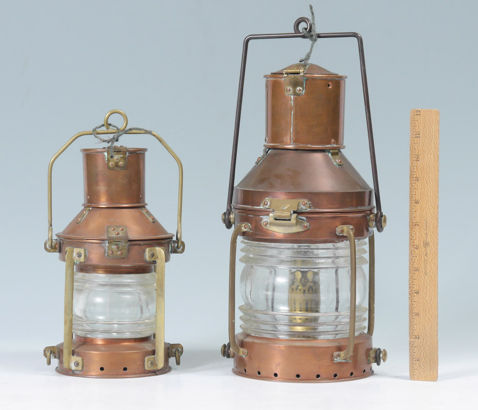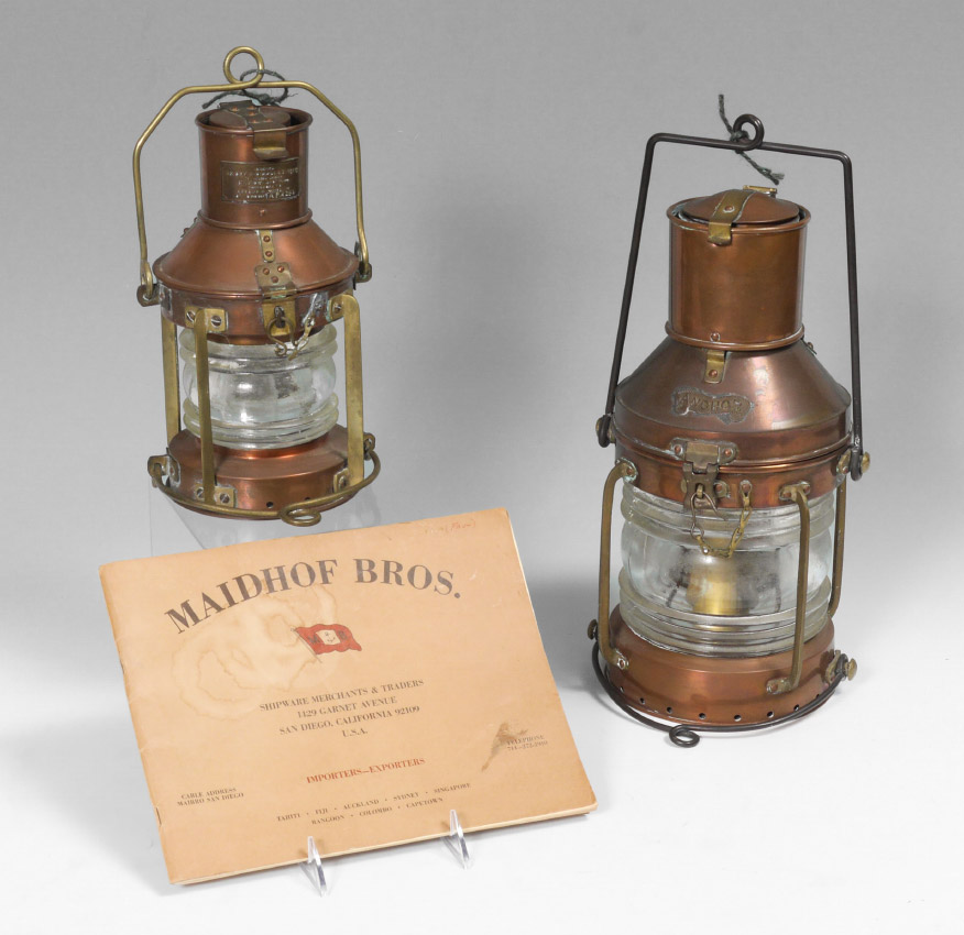 2 BRASS SHIPS LANTERNS: Contemporary production, 2 lanterns, both in original condition and not converted, to include 1) Anchor lantern, hinged lid, original molded glass, overall measures 14'' h. x 7''. 2) Emory & Douglas Co. Ltd., Scotland, with hinged lid, original molded glass, 10 1/2'' h. x 6''. Sold with a vintage Maidhof Bros. Nautical catalog.