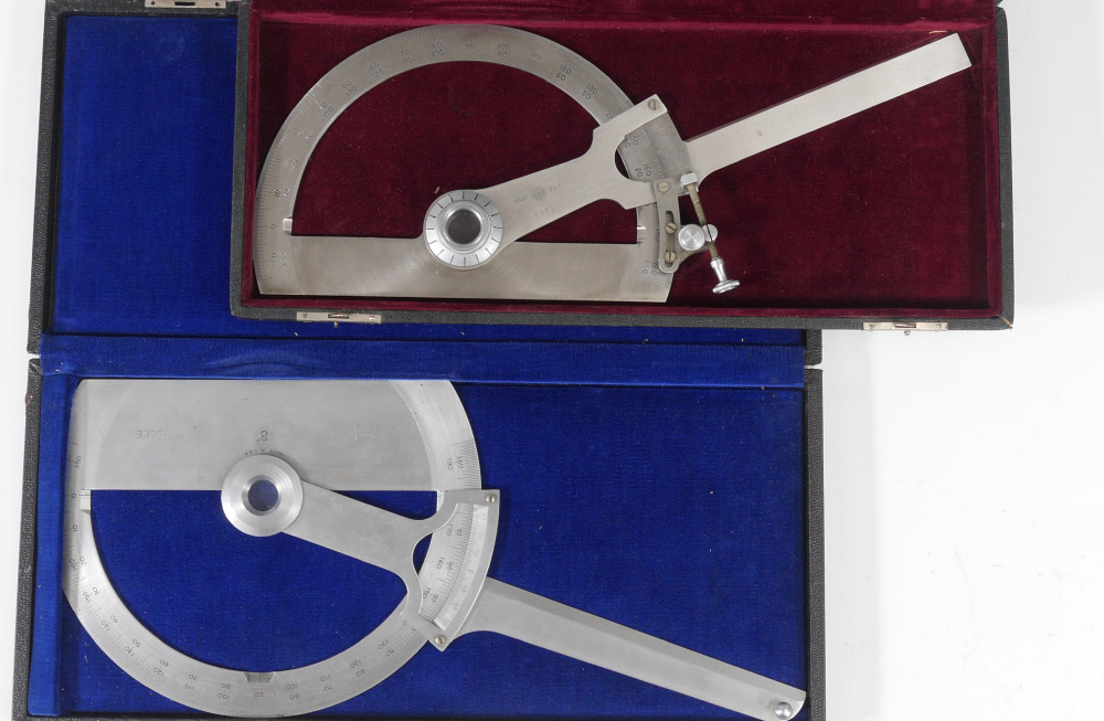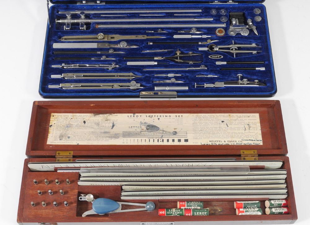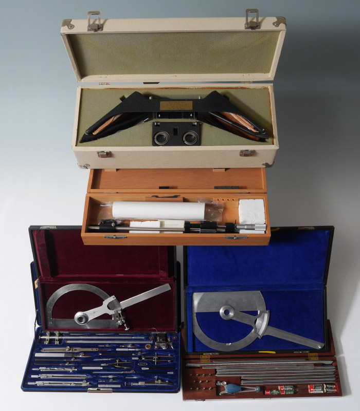 COLLECTION OF PHOTOGRAMMETRY & GEODETIC INSTRUMENTS: From the estate of Col. Louis H. Knipling Jr., doctor and professor of photogrammetry & geodesy, instruments to include 1) Bowen & Company drafting Protractor P-408-A in Army Corps of Engineers original case, 1 1/2'' x 14 1/4'' x 6''. 2) Unknown maker drafting protractor USCE case, 1'' x 14 1/4'' x 6 3/4''. 3) Haff drafting set, complete in blue plastic felt lined case, 1 1/2'' x 15 1/4'' x 7 3/4'' 4) Mirror stereoscope with presentation plaque to Col. Knipling on base, in original case, 6 1/2'' h. x 19'' x 7 1/2''. 5) Gordon Enterprises Parallax Bar in original case 2 3/4'' x 17'' x 5''. 6) Keuffel & Esser Leroy Lettering Set in original case, 1 3/4'' h. x 15 3/4'' x 4''.