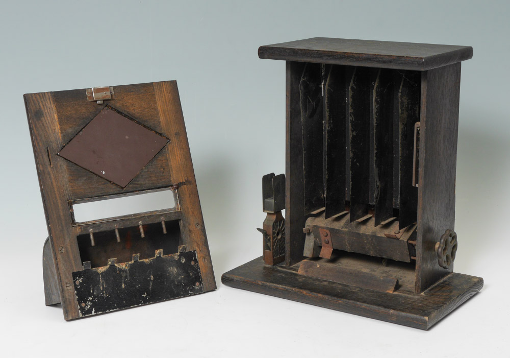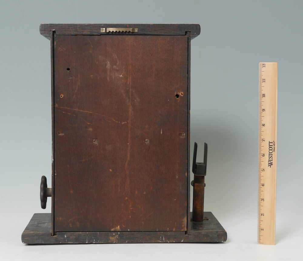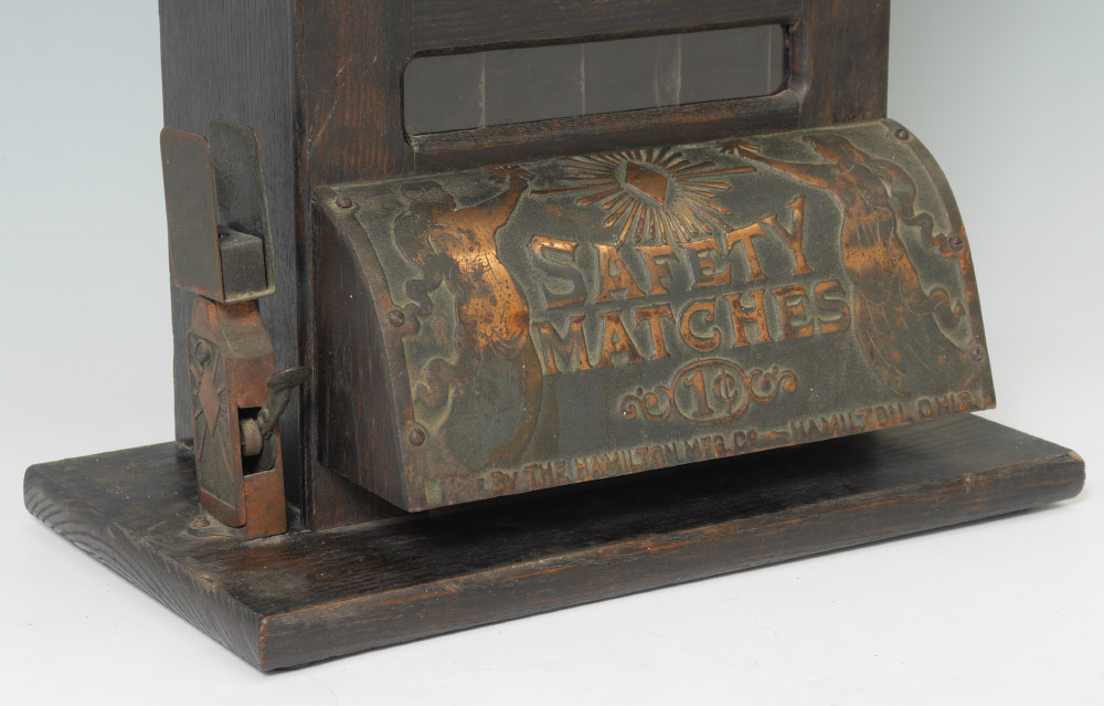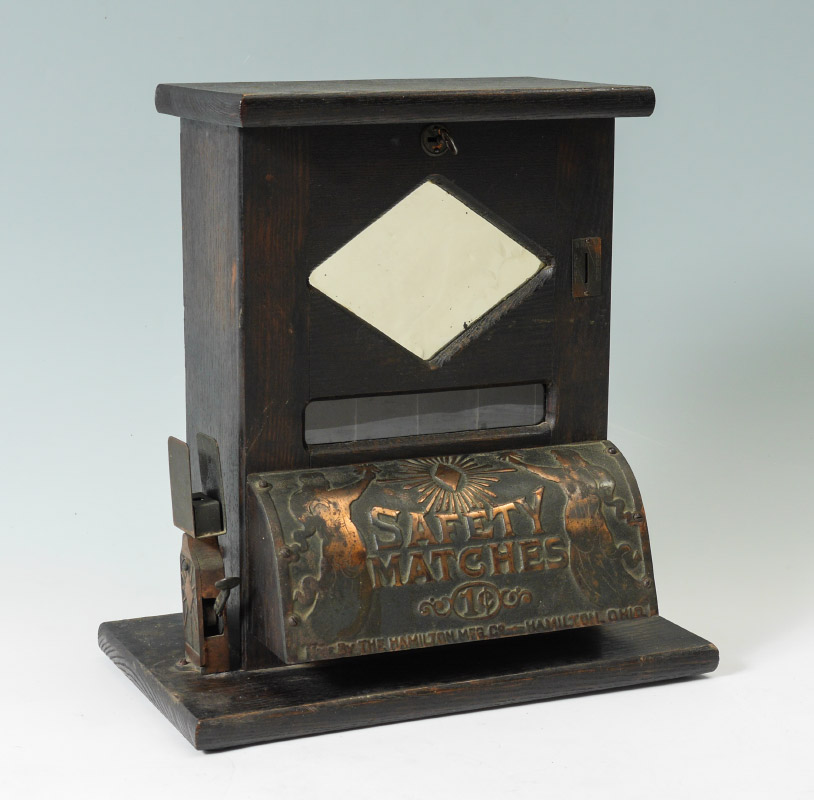 HAMILTON SAFETY MATCHES COUNTER TOP VENDING MACHINE: Early 20th century, oak case with diamond mirror and glass front, cast metal hood with figures of maidens, reads ''Safety Matches, 1 Cent, Made By The Hamilton Mfg. Co. - Hamilton, Ohio''. To operate drop penny in slot and turn handle to receive matches. Cigar cutter and matchbox holder on side. Overall measures 14 3/4'' h. x 13 3/4'' x 8 1/2''.