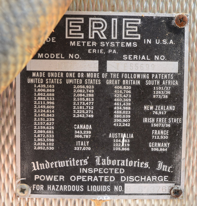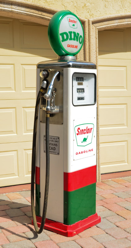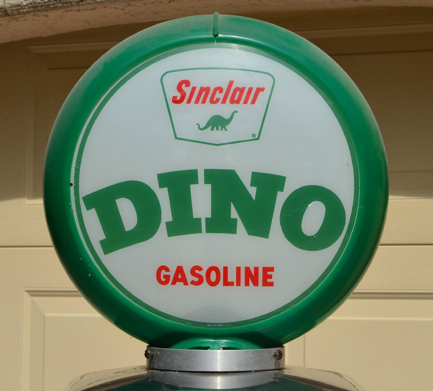ERIE MODEL 158 SINCLAIR GAS PUMP: Serial number TE55699, Sinclair Gasoline emblems and colors, replacement ''Dino'' glass globe. Overall measures approx. 74 1/2'' h. x 24'' x 19''.