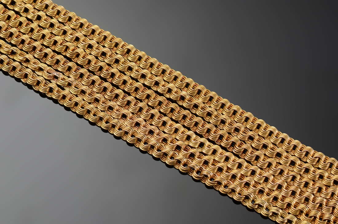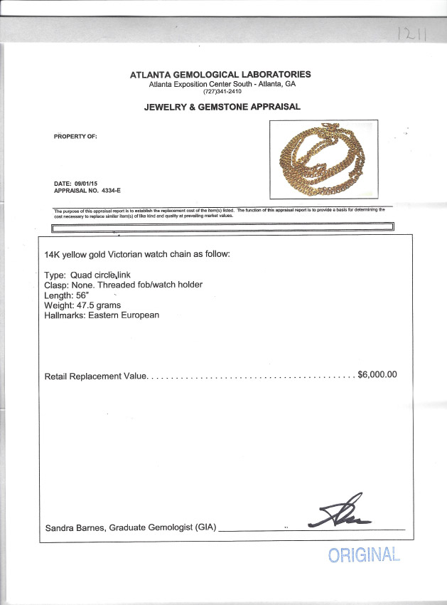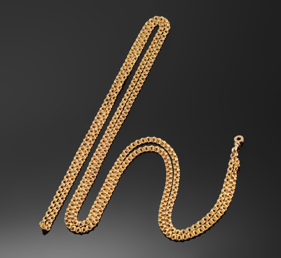 AN ANTIQUE 56'' LONG GOLD WATCH CHAIN: 14K yellow gold quad circle link chain bearing Eastern European hallmarks. Weight 47.5 grams.