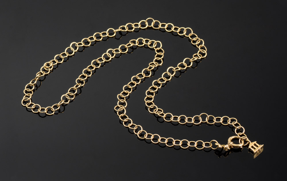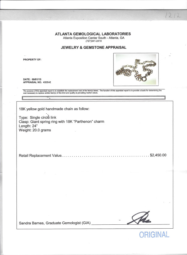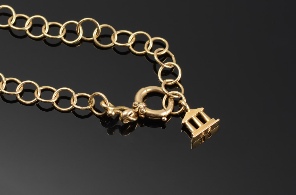 18K GOLD CIRCLE LINK NECK CHAIN: A 24'' hand crafted chain would be perfect as a charm necklace or worn alone. An 18K Parthenon charm is included. Weight 20 grams.